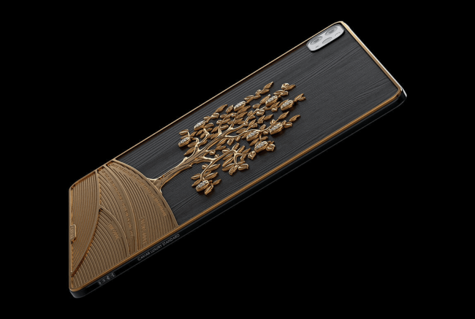 Caviar replaces the housing with a combination of pure gold and rare wood. This intricate masterpiece also uses pure gold for the apple tree and the hill it stands on. The wood panel becomes the backdrop as you spot 9 apples – each encrusted with 9 diamonds for a total of 81.
