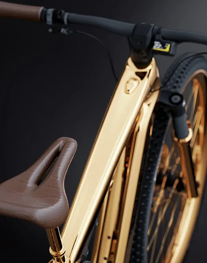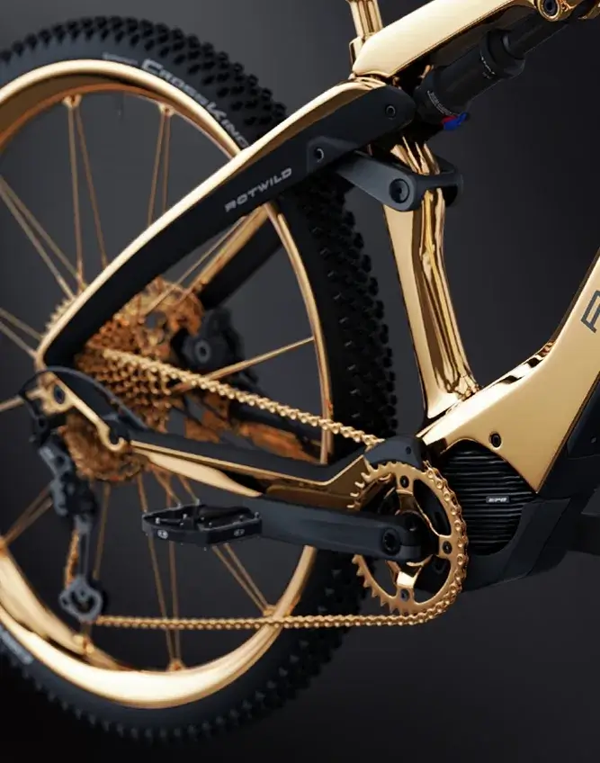 The standard configuration features a sleek frame fabricated out of carbon fiber for its superior strength-to-weight ratio. However, the composite seems to have been coated with an 18-karat gold alloy, which underwent a sophisticated treatment to improve its durability. To match the glittering motif, titanium components with gold PVD are integrated into the build.