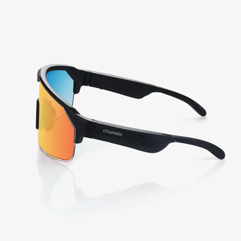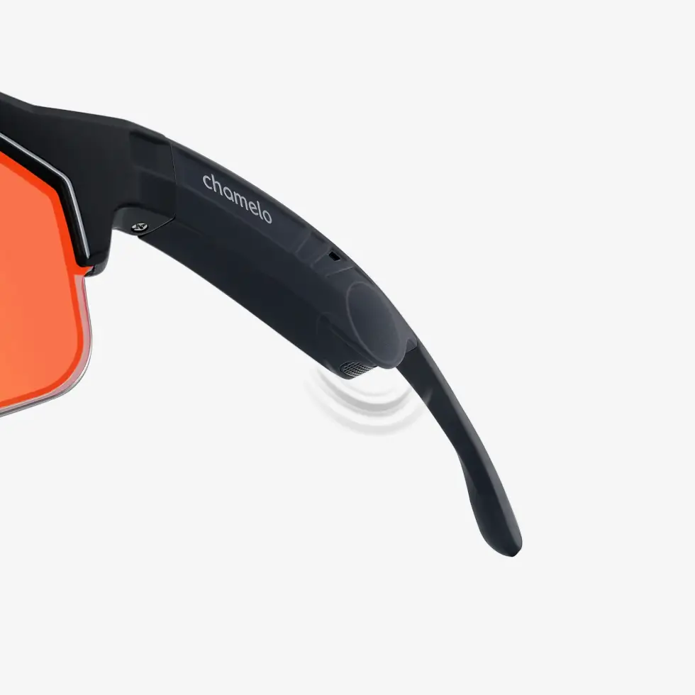 Chamelo Eyewear’s Music Shield sunglasses run on a 180mAh battery that offers 100 hours of life when used for tint adjustment. It runs for 6.5 hours when listening to audio. It recharges to 80% in 30 minutes via a custom pogo pin cable or the Dusk wireless charging case. LED lights indicate when the battery is charging.