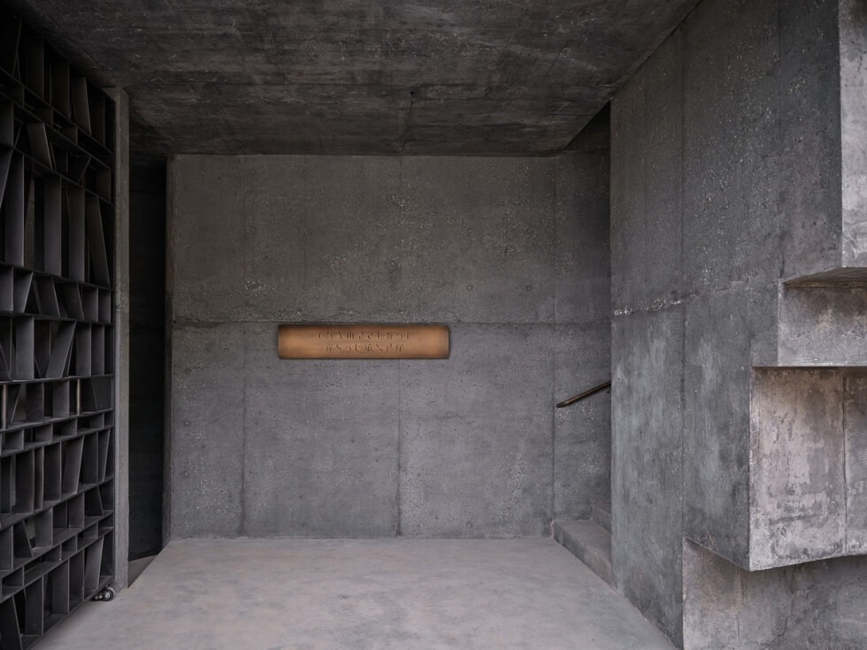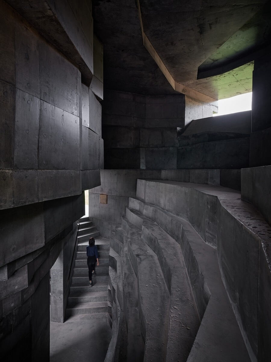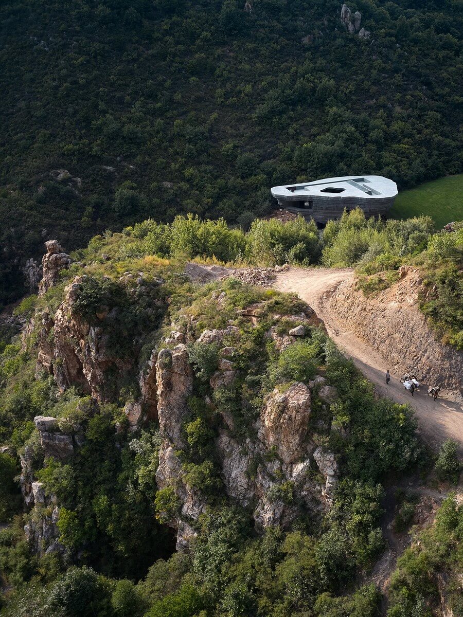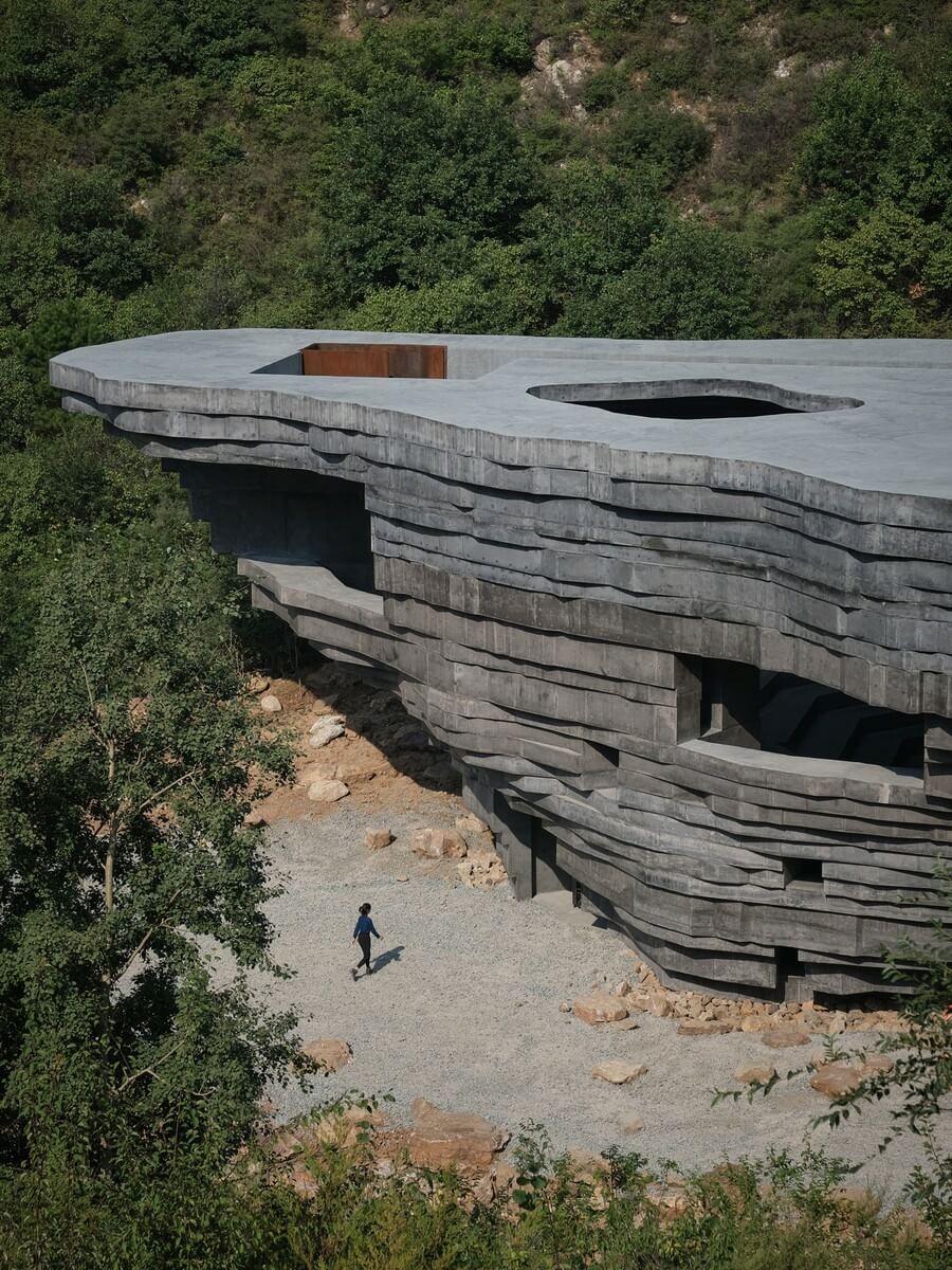 Everything about the Chapel of Sound is a mix of concrete with aggregates from the local mineral-rich rocks. The form looks like an upside-down chunk of rock that was repurposed into a concert hall. Inside, there are winding staircases that eventually lead to the rooftop. Up there, guests can marvel at the breathtaking views of the valley and even the Great Wall.