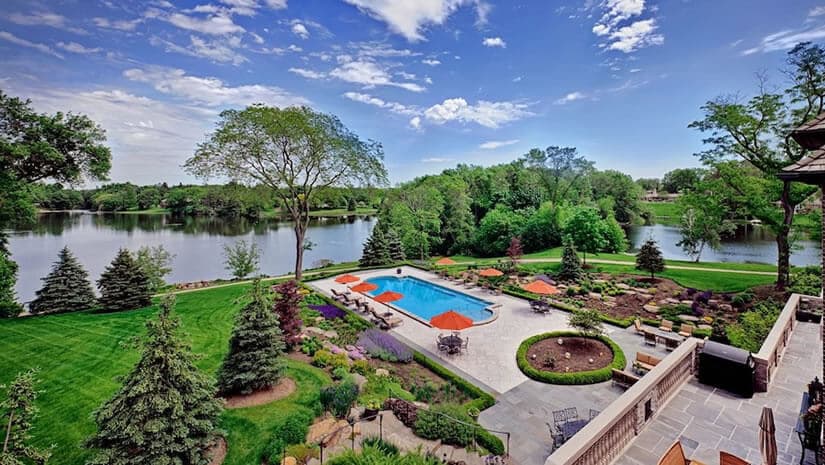 This wonderful 5-bedroom French provincial mansion sits proudly between two lakes in Bucolic, Barrington Hills, Illinois. The 8.5-acre estate enjoys frontage on Keene Lake and Heather Lake, offering wonderful views, as well as excellent opportunities for water-based activities.