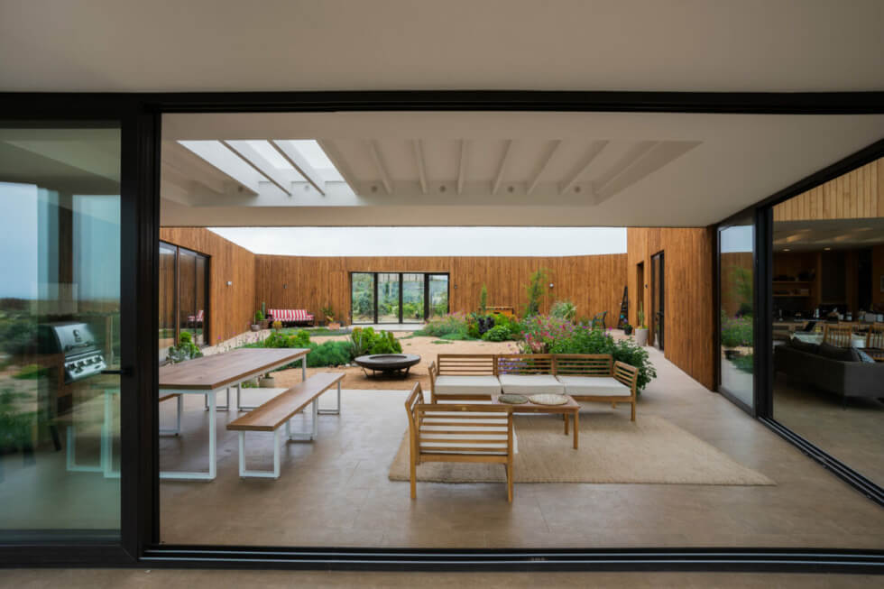 “We tried to gradually blur the limit between the open and closed spaces while preserving the nature of the local landscape in a large central patio. This is where the family can exponentially inhabit, tying circulations, views, and access to all the programs of the house,” DX Arquitectos says of the design.