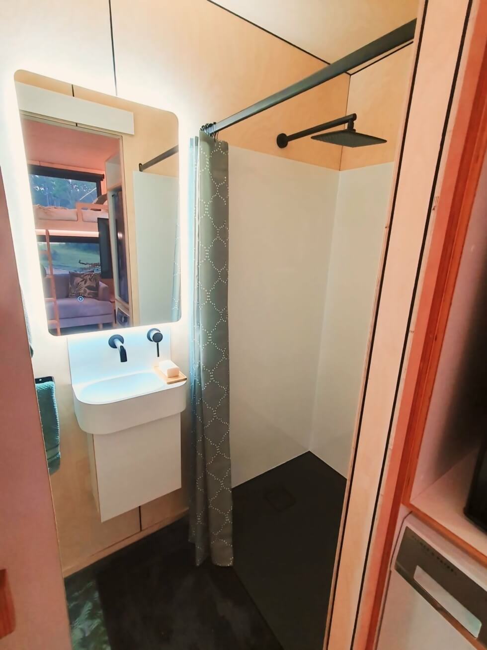 Meanwhile, the bathroom in the Chipper Tiny House is located on the other side next to the kitchen accessible via a sliding glass door. It’s surprisingly generous with a shower, small vanity sink, flushing toilet, and storage space. In terms of power, it benefits from an RV-style hookup although it’s also customizable with off-grid capabilities via solar panels, water tanks, and composting toilet.