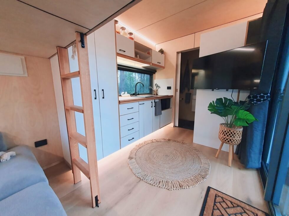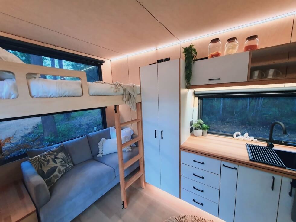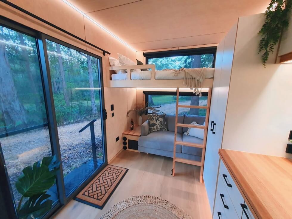The Chipper Tiny House really lives up to its name. It feels cozy the moment you step inside sliding glass doors. Inside is 12.5 square meters of well-utilized space, featuring a double bunk bed on one side set against a long glass window. Underneath it is a small living room with a sofa bed and provision for a side table and mounted TV. It benefits from natural light through another glass window.