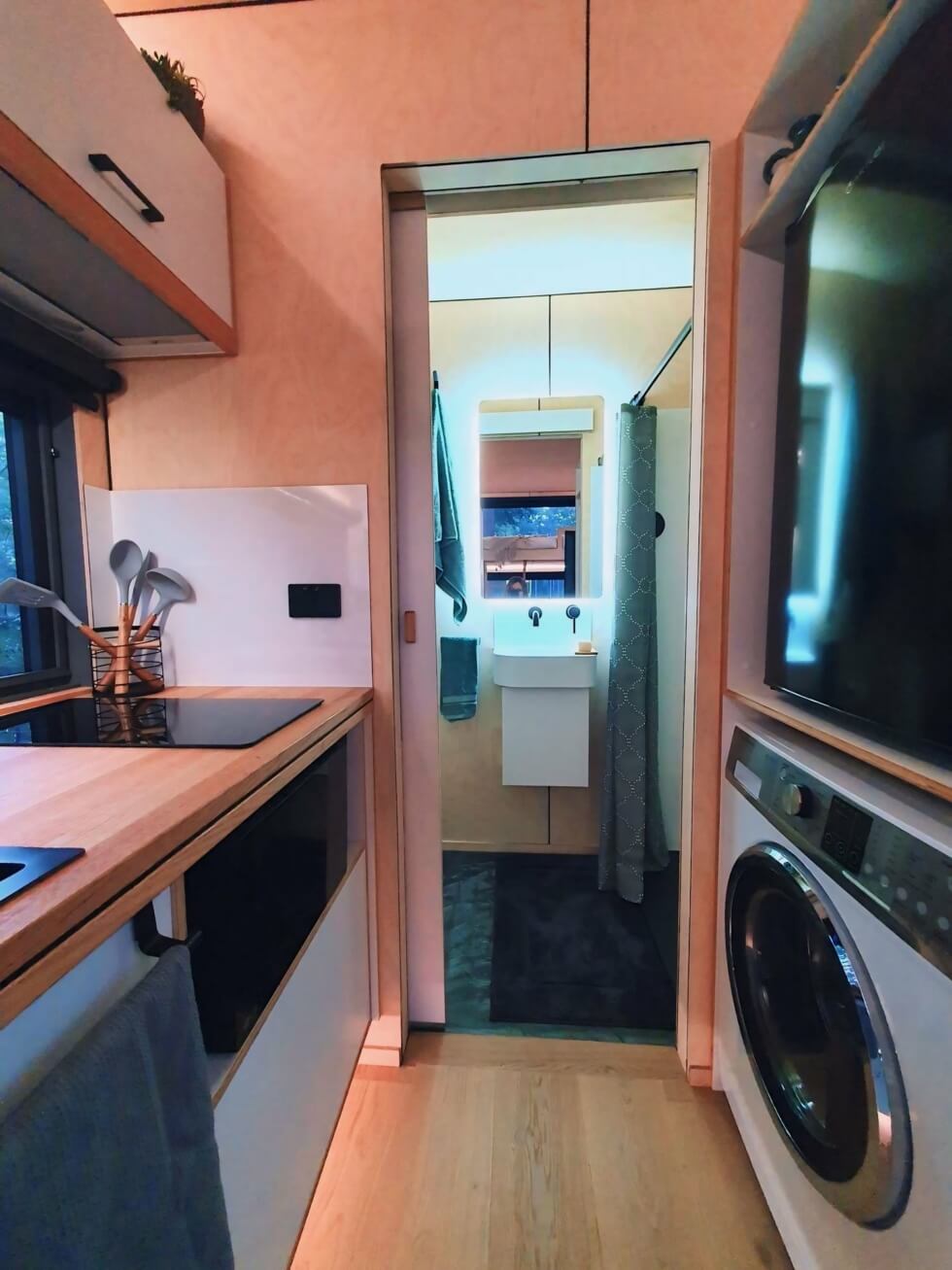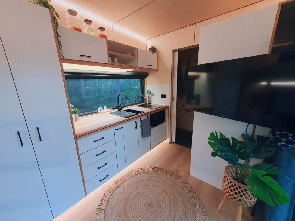 Despite its tiny size, this home still manages to integrate a wardrobe and a modest kitchen with plenty of cabinetry for storage. The kitchen also has an induction cooktop, a sink, and space for a dishwasher, oven, fridge, and washer/dryer.
