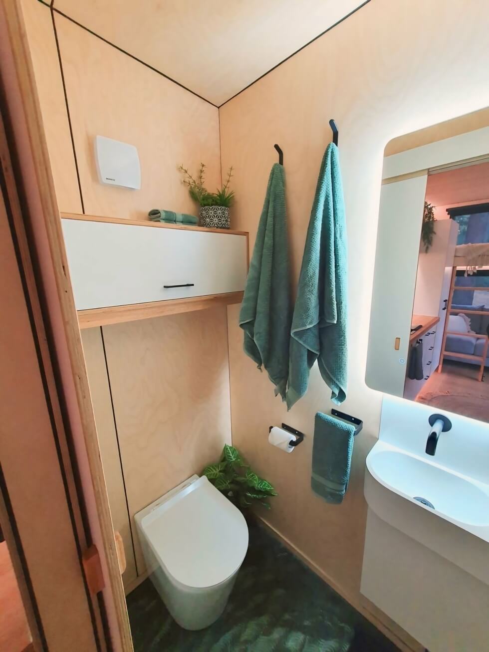 The Chipper Tiny House by Australia’s Häuslein Tiny House Co. offers a micro-living experience ideal for quick stays or rentals. Despite its compact size, it can comfortably sleep two and even has cooking and bathing ammennities.