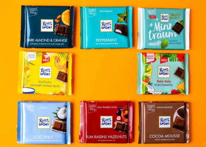 Ritter Sport changed the chocolate world with its square bars made of 16 smaller squares. The square chocolate confection has more than 30 varieties, with one for every day of the month and two for Sunday.