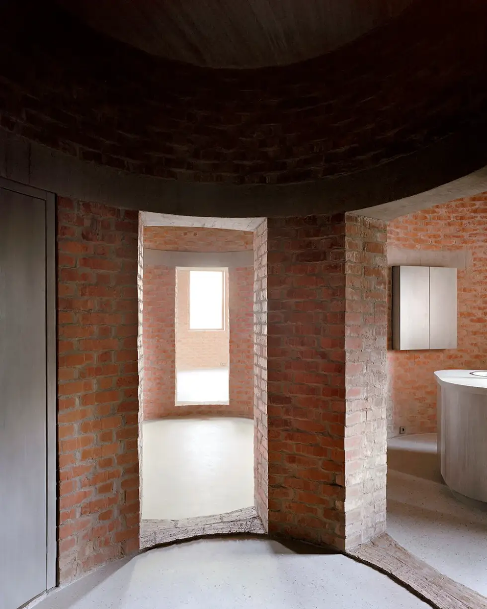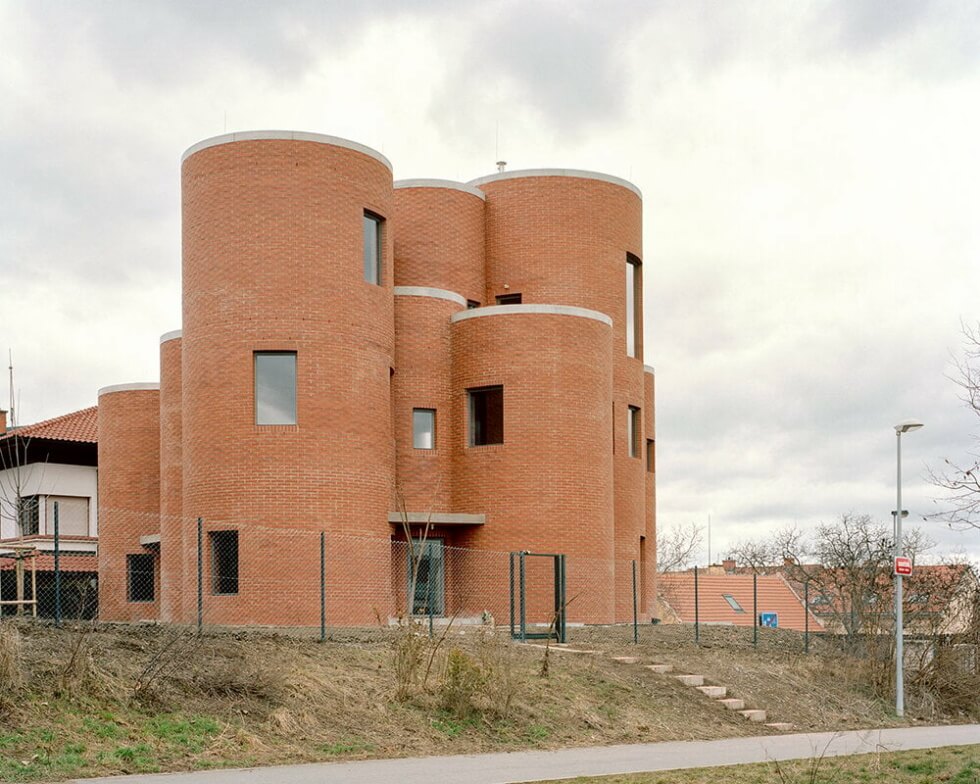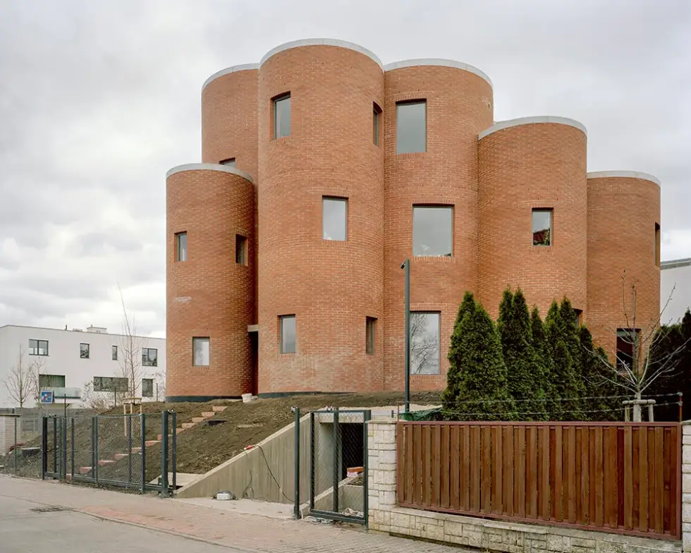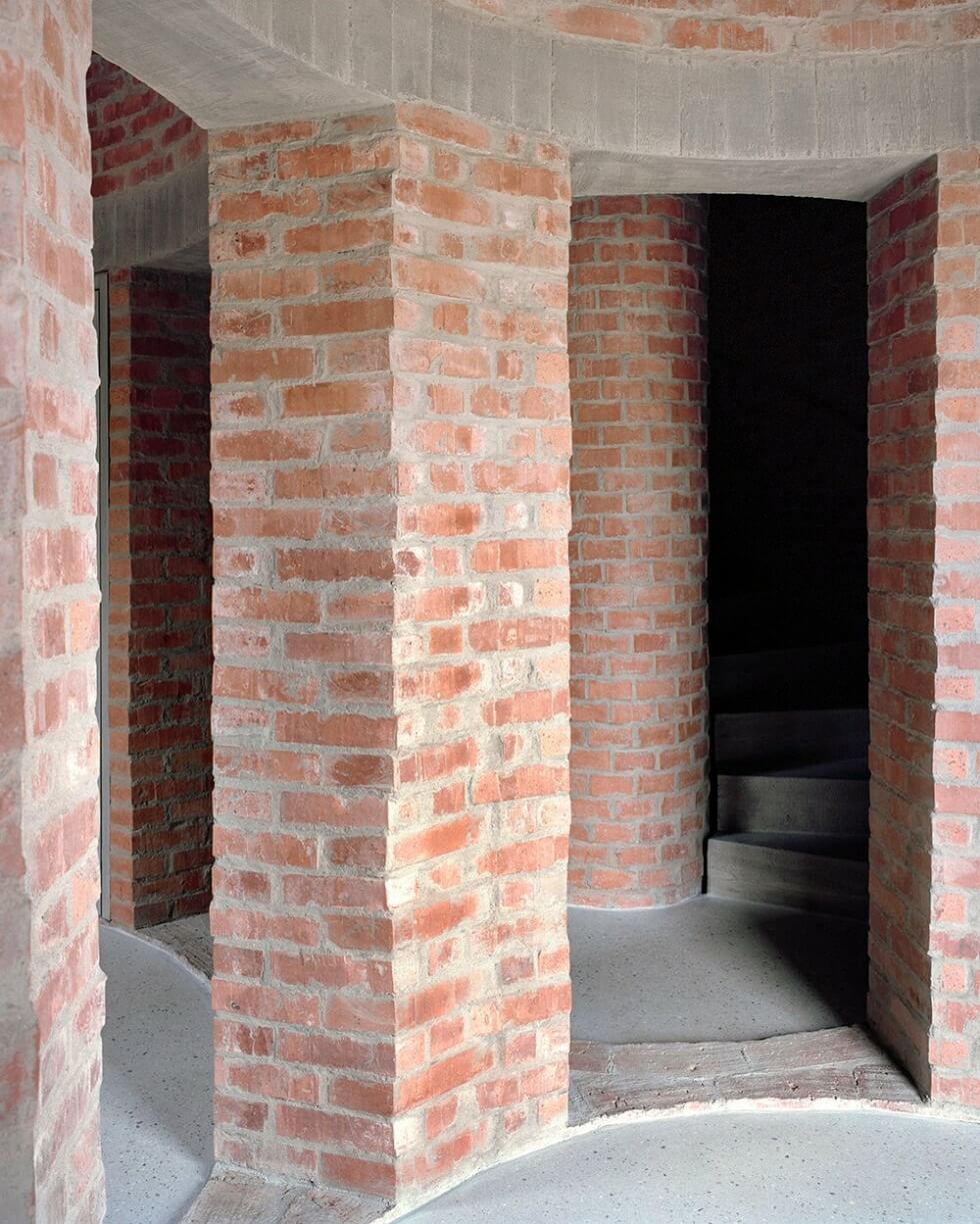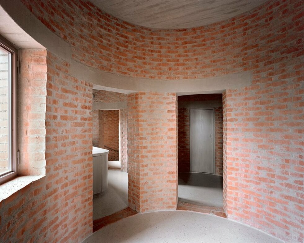 Bricks make up the entirety of the structural form and even extends to the interiors, where it is devoid of dividing walls. The construction is actually a housing project, which is divided into three apartments and formed by 16 tangent cylinders. It hosts 39 rooms and every outline of the rooms is visible from the outside due to the absence of the dividing walls.