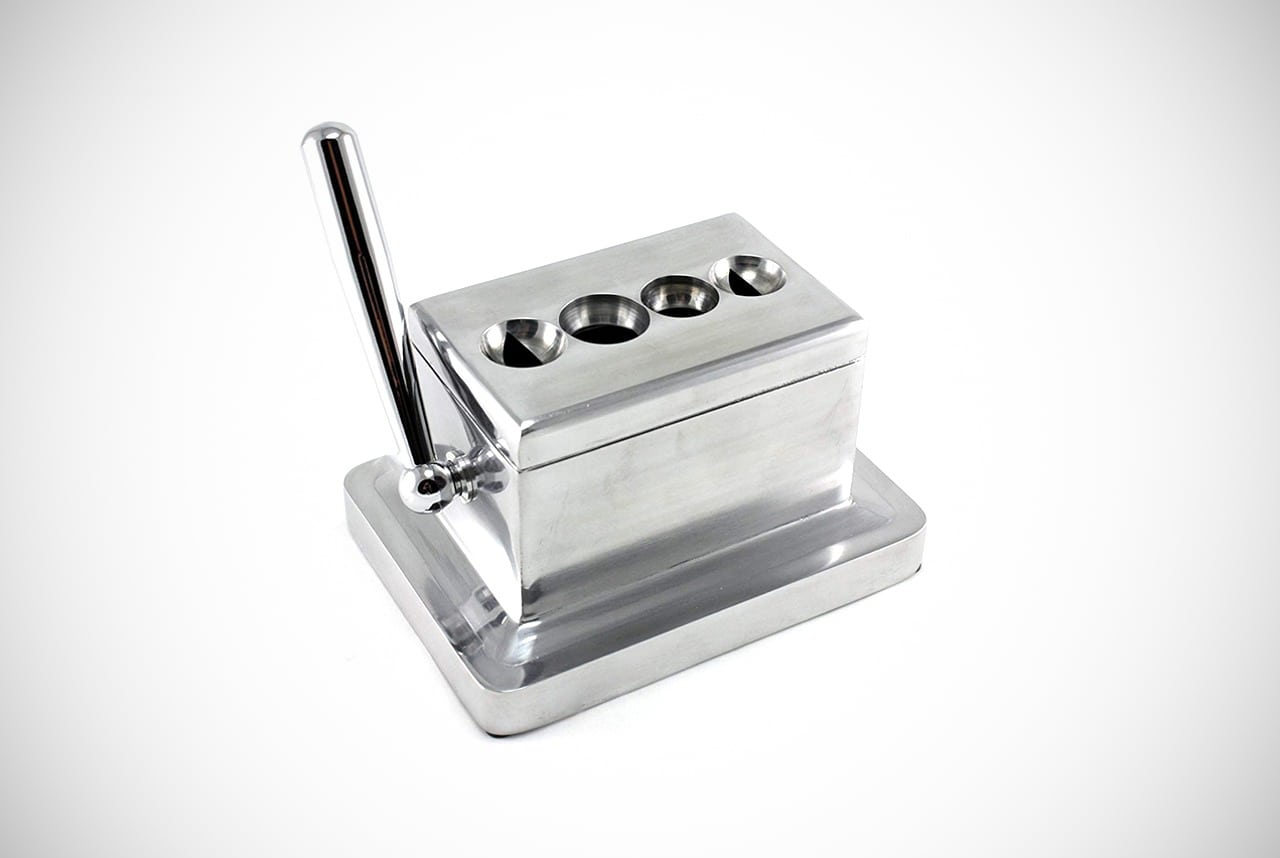 Is your desk at home looking a bit bland? Want something to sit next to your automatic pencil sharpener? Then what about the Table Top Quad Guillotine and V-Cut Cigar Cutter? This heavy cast aluminum cutter gives you the option of four different holes to use for different sized cigars. Two of those holes contain guillotine cutters and the other two have V-cutters inside. All you have to do is place the tip of your cigar into the hole of your choice and pull the lever.