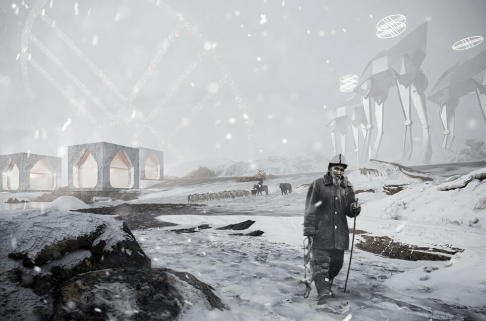 Designer Batyrkhan Bayaliev envisioned yurts in 2122 to be futuristic in nature, unlike what they are today. These round tents that nomadic tribes from Mongolia, Kyrgyzstan, and eastern Kazakhstan call home, normally have skins or felt covering them for protection from the cold. But given the threat of climate change, Kyrgyzstan-based Bayaliev opted for a modern reinterpretation that befits its time. He called his concept “Kyrgyzstan 2122.”