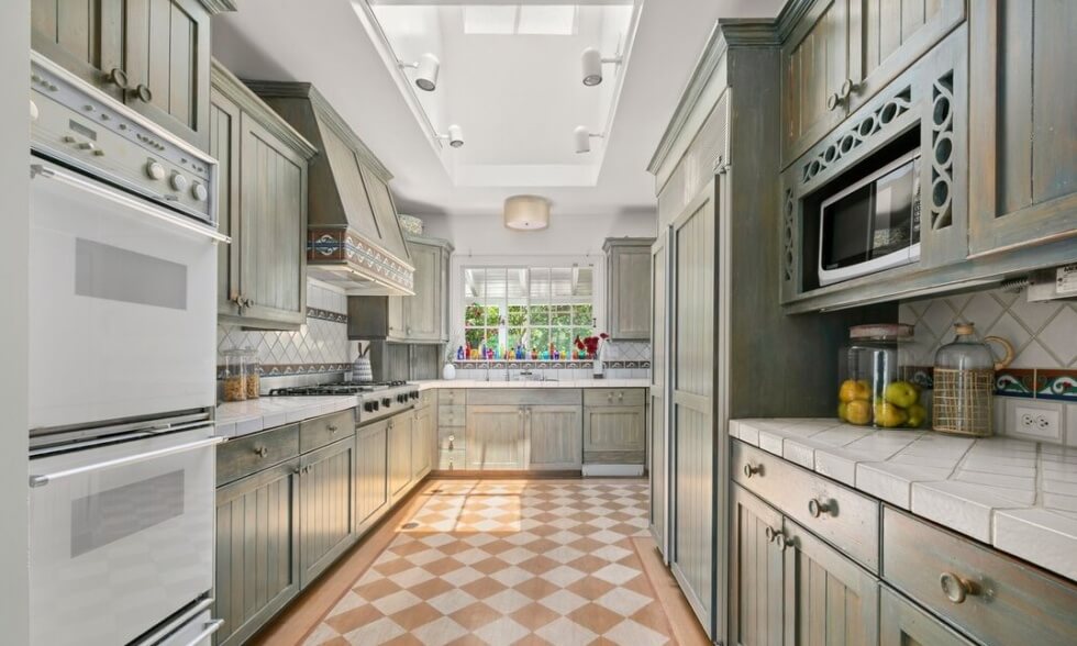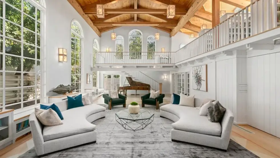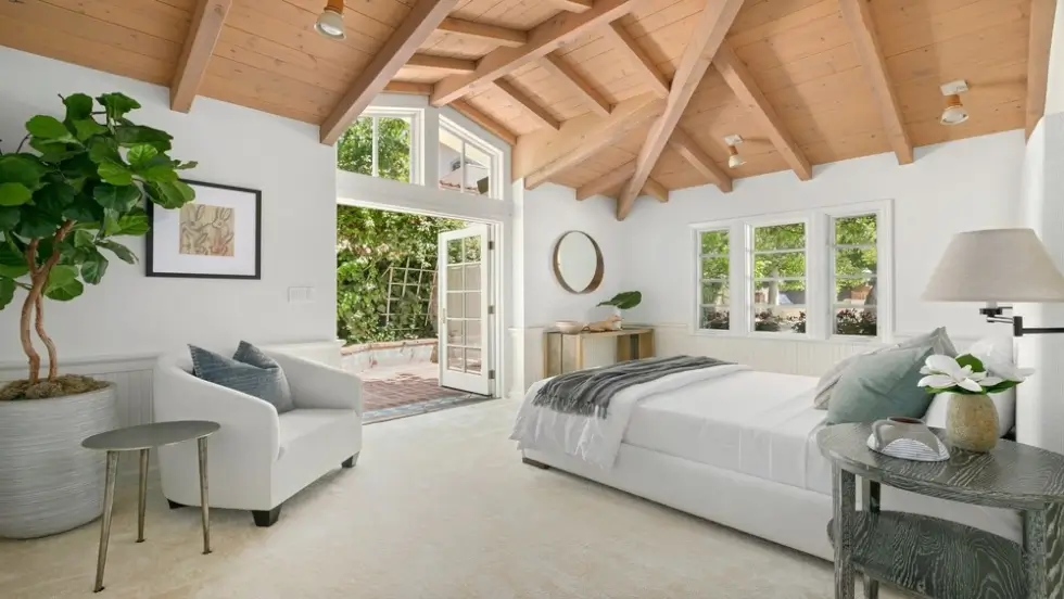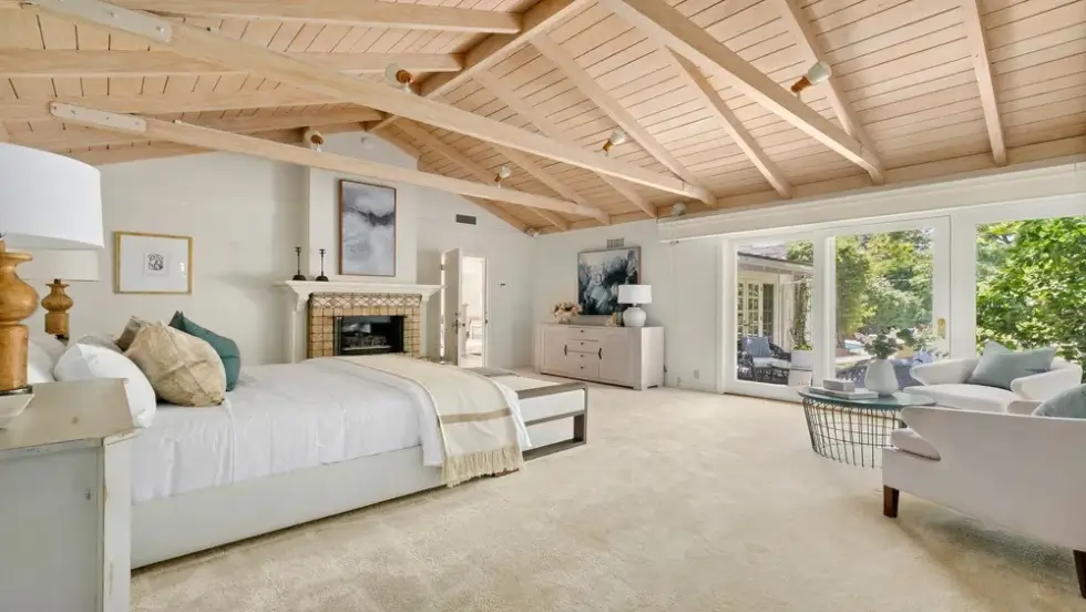 For its interiors, the Contrapuntal House boasts soaring wood-beamed ceilings, a cozy fireplace featuring Malibu tiles, and skylights that brighten the spaces. Moreover, a giant wall of French doors in the dining room overlooks the garden while the gourmet kitchen looks out to the pool.