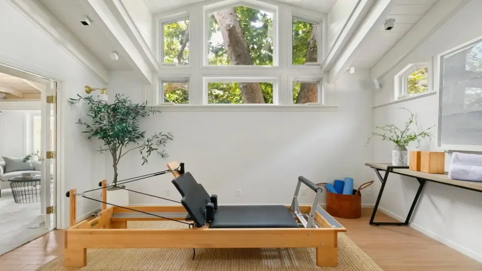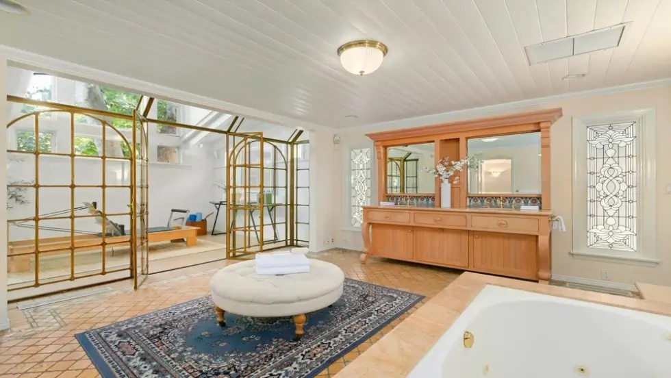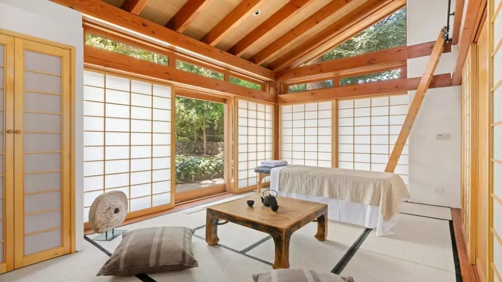 One of the home’s attractive features includes the opulent and inviting five-room primary suite. The bedroom has its own walk-in closet, a marble fireplace, and an exquisite bathroom in marble, and Malibu tile with a deep soaking tub, shower, and private water closet. It is connected to a French Orangerie-inspired gym and a Japanese-style zen retreat for meditation, spa, or massage.