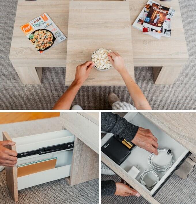 This smart table also features two secure AC power ports. A hidden storage bin keeps your electrical cords tucked neatly and safely. Storage-wise, this table has two pull-out drawers, a hidden compartment under the pop-up extension,  and a sliding dual-level side drawer.