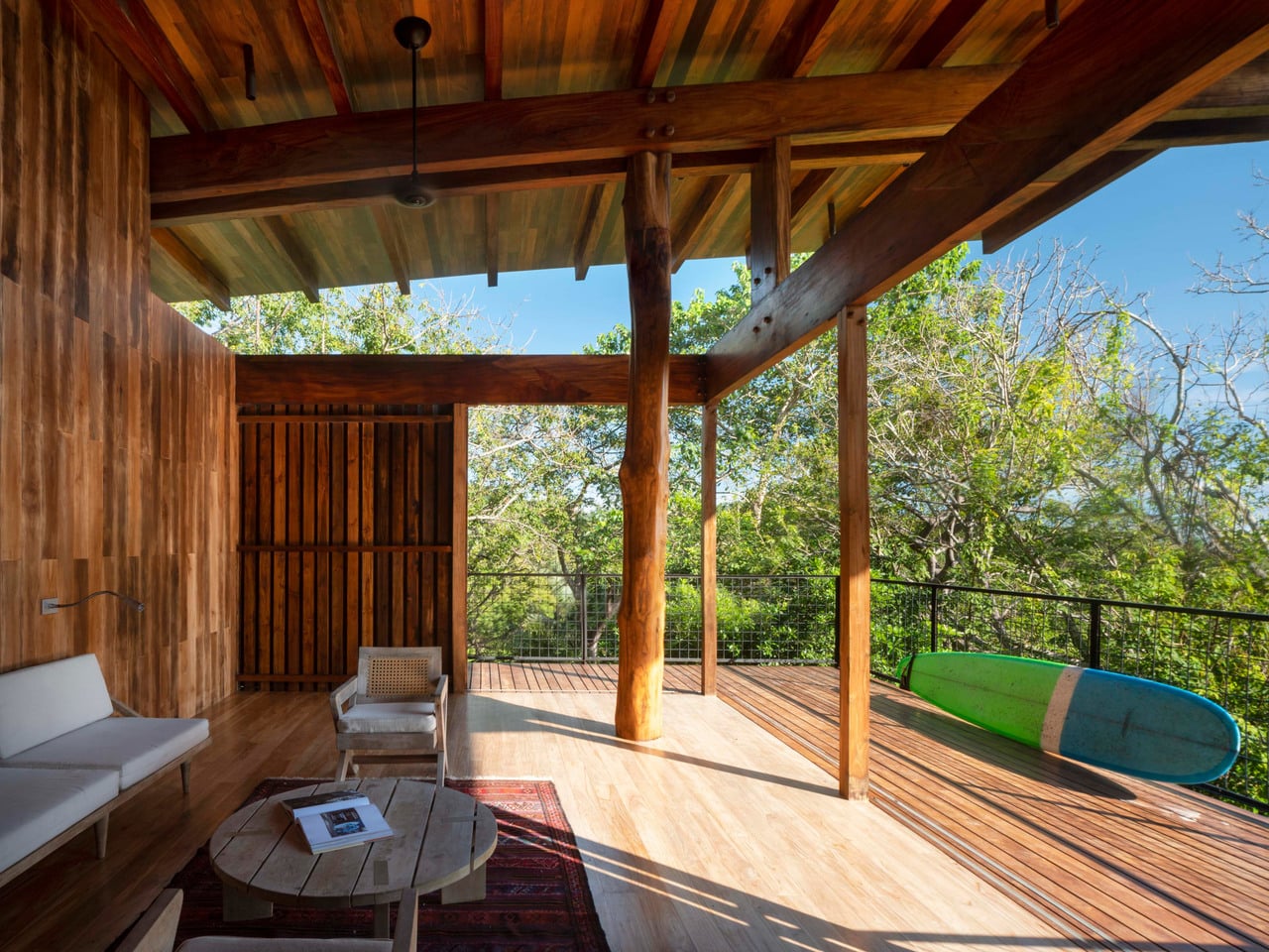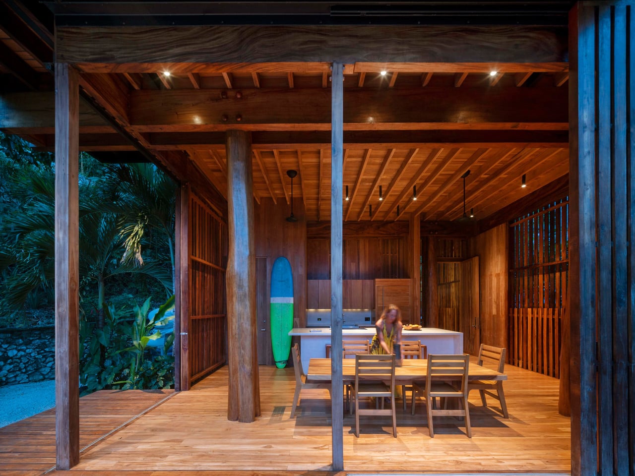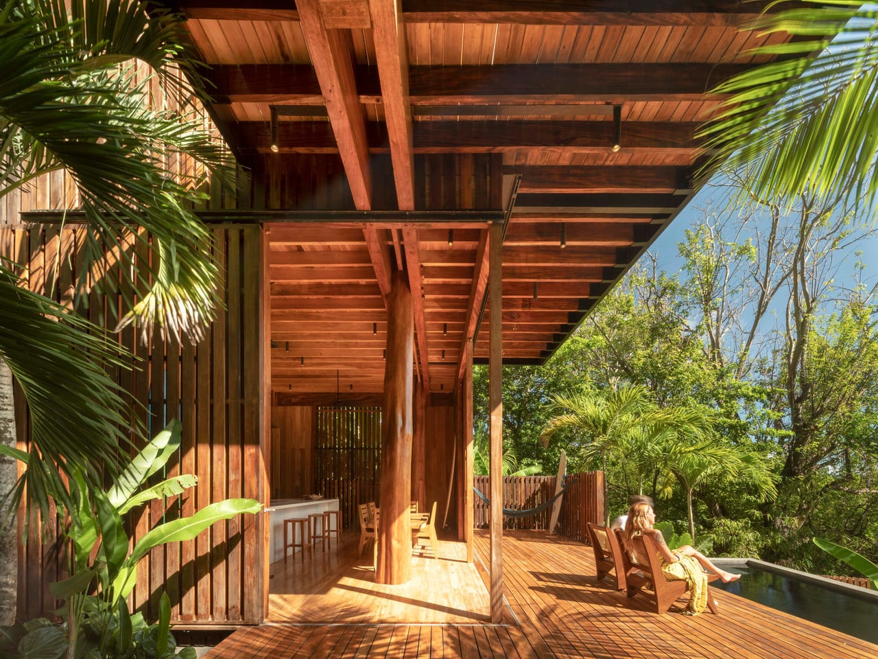 Both teak and cenizaro wood feature predominantly here, as does wood and metal, which make up the roof. That extends beyond the building, providing ample shade and protection come rainstorms.