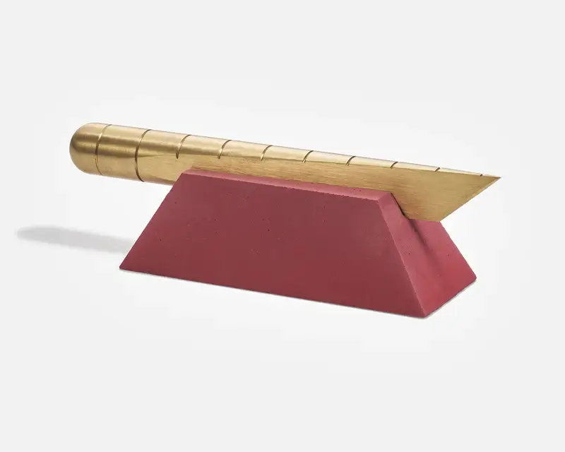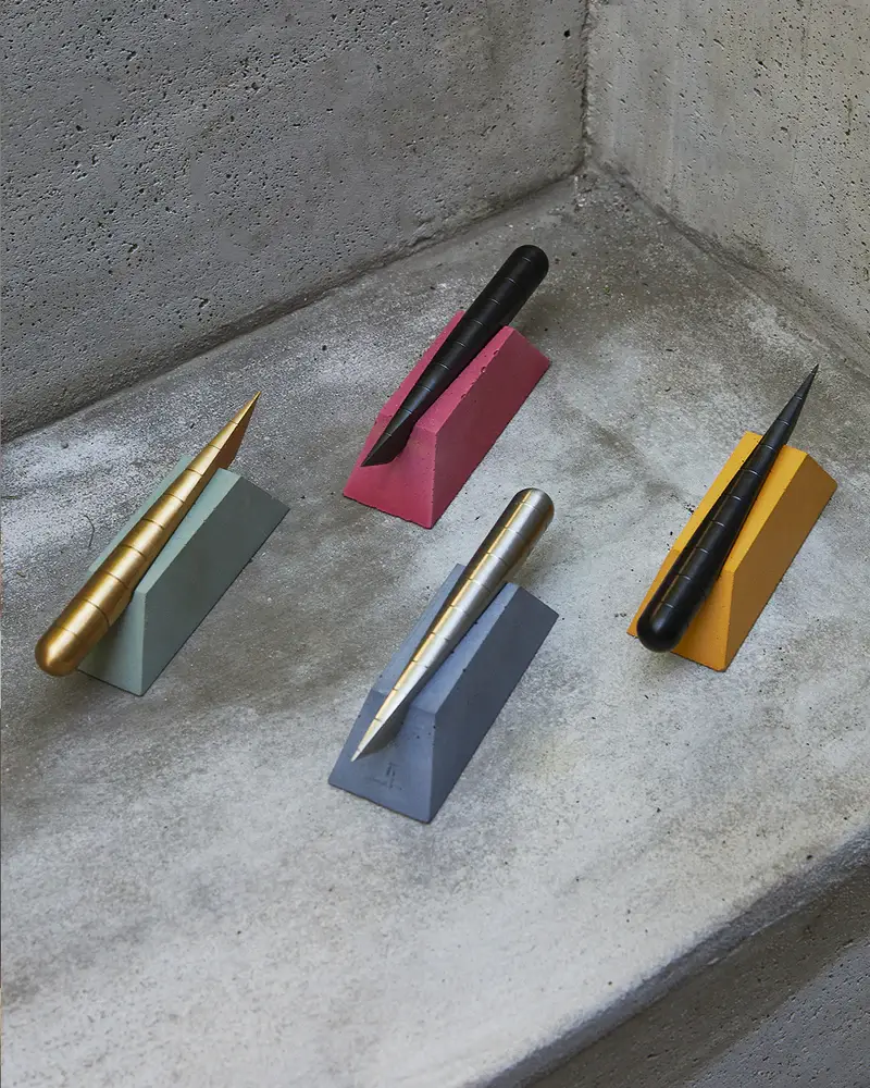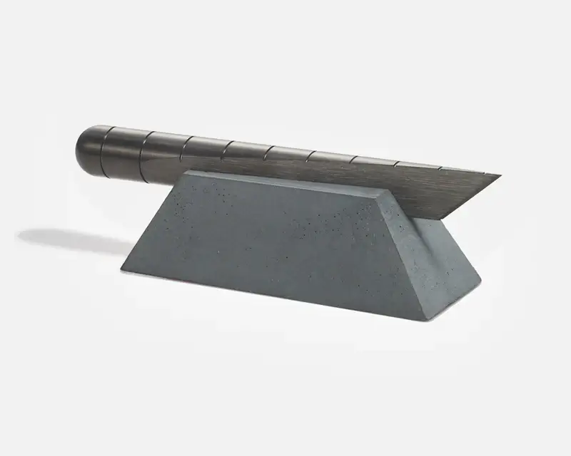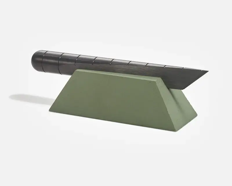 This collaboration between Vicente Muñoz and Craighill comes with a pyramidal base and individually cast in pigmented concrete. It features a void that holds a knife securely in place along its center of mass.