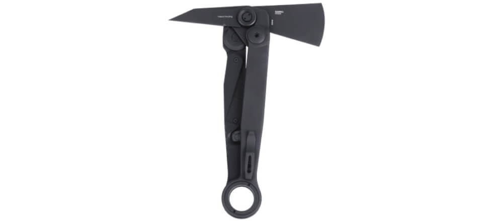A deadbolt lock featuring two lugs safely secures both blades in place during use. Meanwhile, pushing the button on the side of the axe head allows the two striking surfaces to fold into the frame so you can close the tool after use. Closing the tool automatically sets the safety lock which prevents accidental opening. It keeps the blades in a cocked and locked position until the next use.