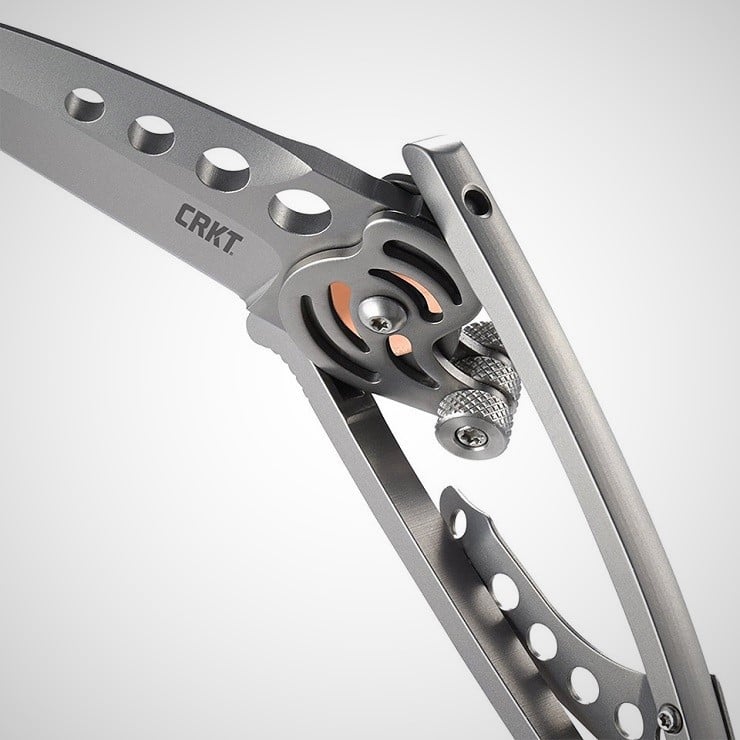 The knife is a Rotating Snap Lock (RSL) that features a cam-locking system with dual thumb screws for opening with either right or left hand. Rather than flipping up and out, the blade swings around 180° from the side and then locks in place. With the handle clip removed, the blade will swing around a full 360° since the handle is an open framework. This skeletonized design allows for ambidextrous use of this very light everyday carry knife.