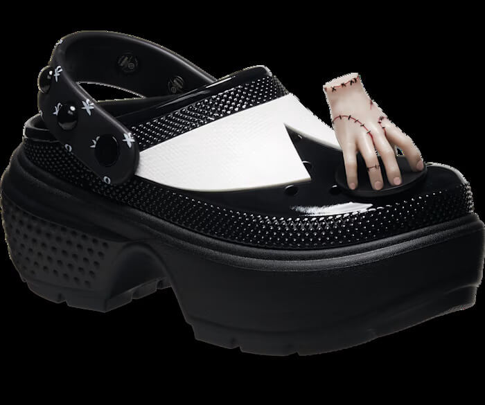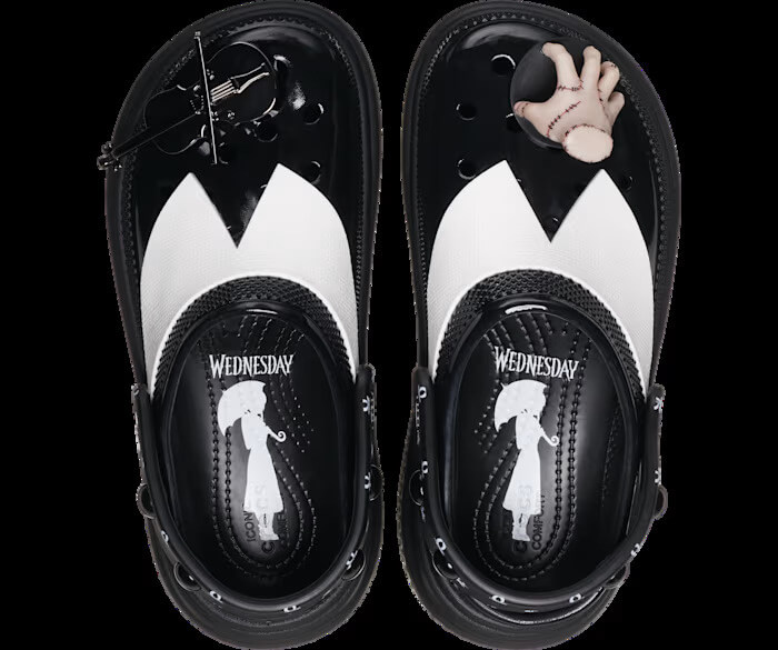 This limited-edition release also has an exaggerated platform sole built for stomping through the streets or in the graveyard. Of course, no Crocs are complete without their signature charms. Crocs’ Wednesday Stomp Clogs have two exclusive Jibbitz featuring dimensional charms like Thing (see the hand) and a miniature black cello.