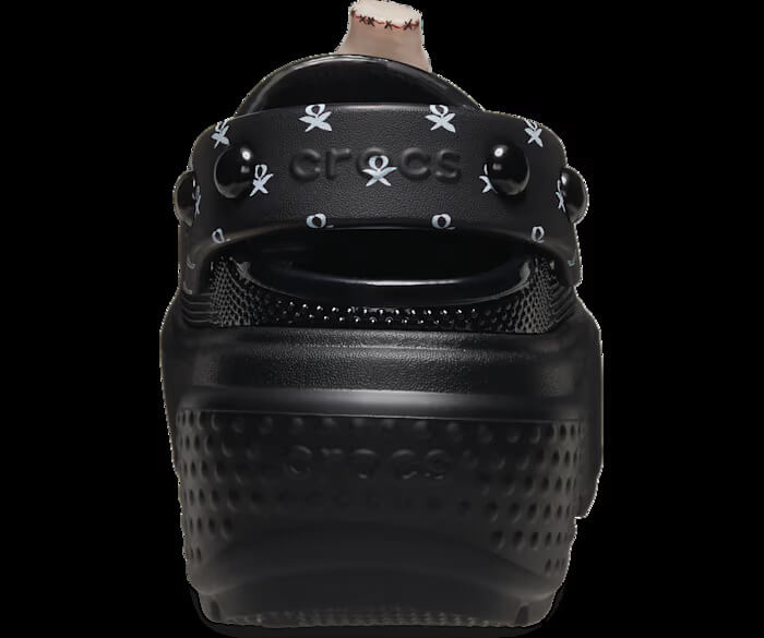 The Crocs Wednesday Stomp Clogs have glossy molded Croslite uppers with molded white TPU collar details. Clearly a design shoutout to the character’s schoolgirl outfit. It also features pivotable dome ankle straps with printed design and fixed dome studs for a secure and comfortable fit.