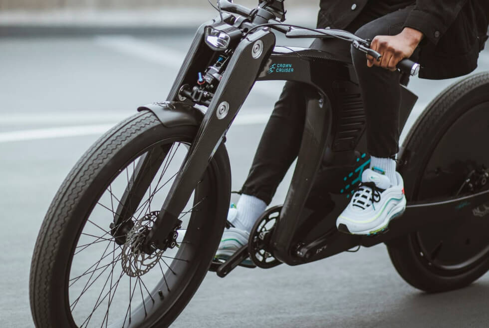 On the other hand, maybe, it’s the carbon fiber frame. The creator of this e-Bike draws inspiration from British racing. Starting with the monocoque’s composite construction, the CrownCruiser weighs in at just 55 lbs. The robust properties of the material also mean that it can support rides up to 330 lbs.