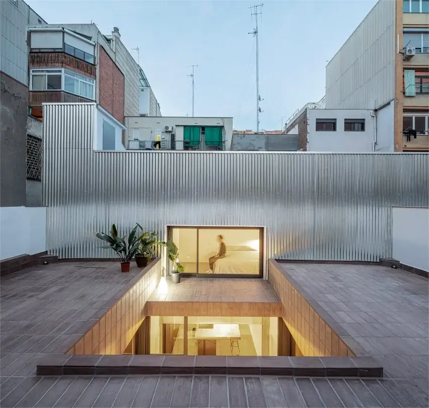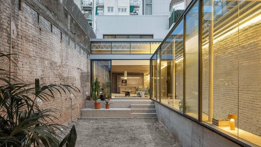 Spanish architecture studio CRÜ turned this old public laundry in the district of Les Corts into a house and studio for a couple in west Barcelona. Called La Clara, the renovated structure benefits from a two-story volume at the rear and a studio space at the front on the ground floor.