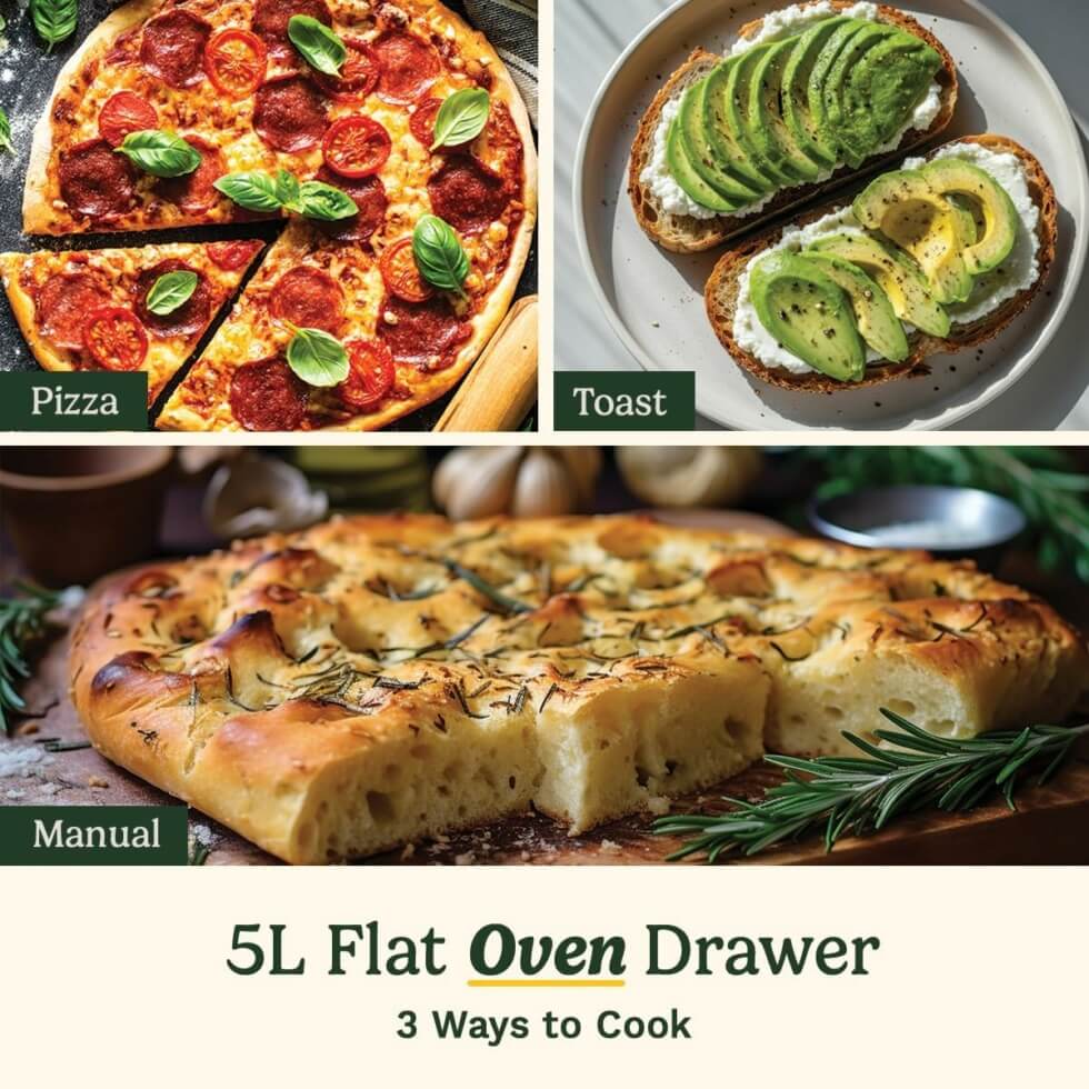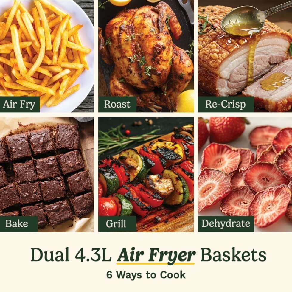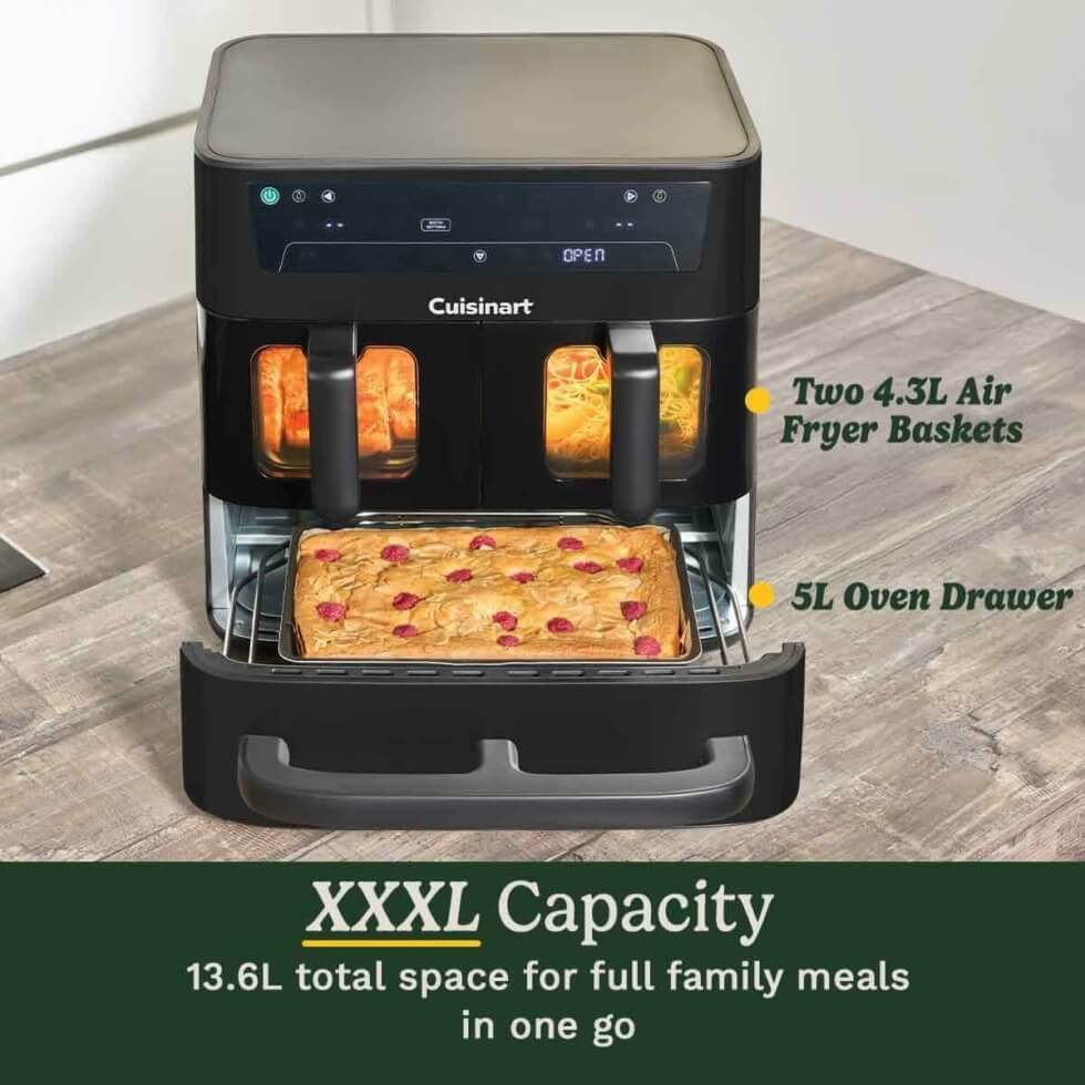 Designed and engineered with total meal preparation in mind, this kitchen appliance offers three independent cooking zones for simultaneous cooking. It has two 4.3L air fryer baskets that sit side by side and a 5L flat oven drawer underneath. The setup allows you to cook multiple dishes or the entire meal from the main dish to dessert.