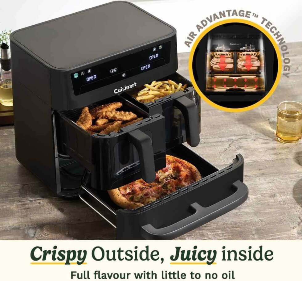 The Cuisinart Tri-Zone Air Fryer & Oven elevates the humble air fryer design, offering a versatile cooking solution in terms of capacity. It’s ideal for large families or those looking for a multifunctional cooker because, as its name implies, it has not just one but three cooking zones.