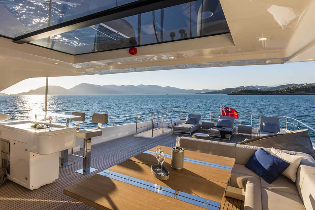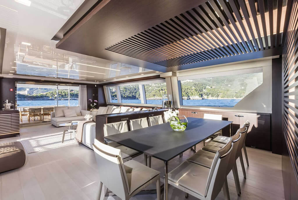 One of the best features of Custom Line 108 is its remarkable transparency, with glass playing a considerable role in its design. The 387 square foot flybridge is entirely customizable, which gives owners the privilege of really putting a personal mark on their expensive toy. All other decks are lavishly appointed to support a fancy lifestyle, both inside and on the generous outdoor decks.