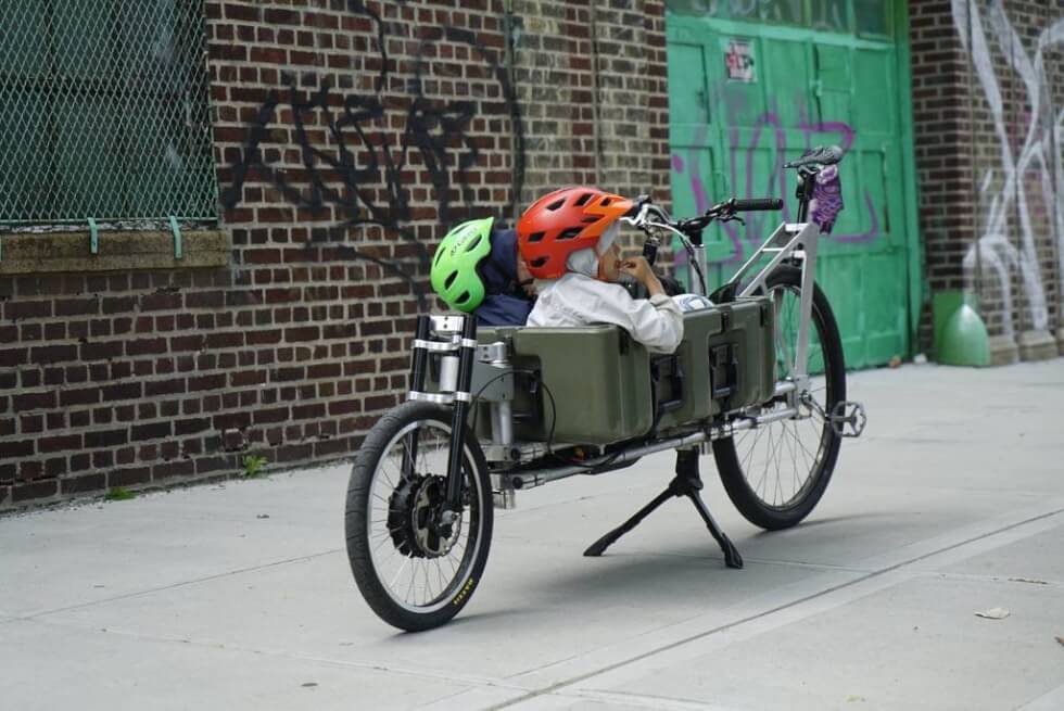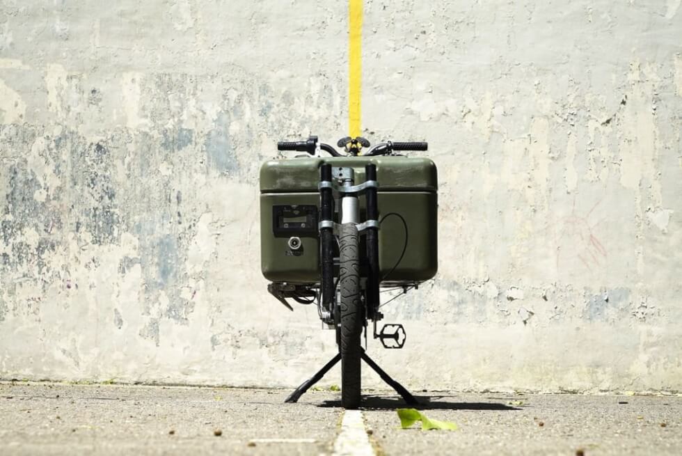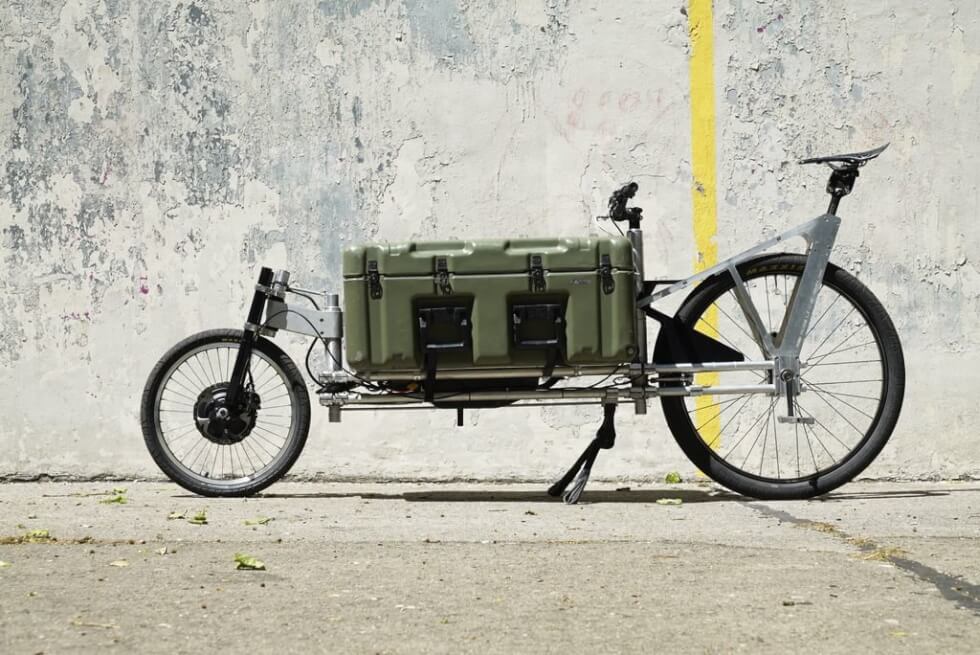 It’s funny because a huge section of the electric bike is actually a Pelican Hardigg transport case. The size of the military-grade cargo box can fit up to two people (awkwardly we suppose). On the rear is a freewheel hub with pedals. This drops the need for a gear and chain assembly.