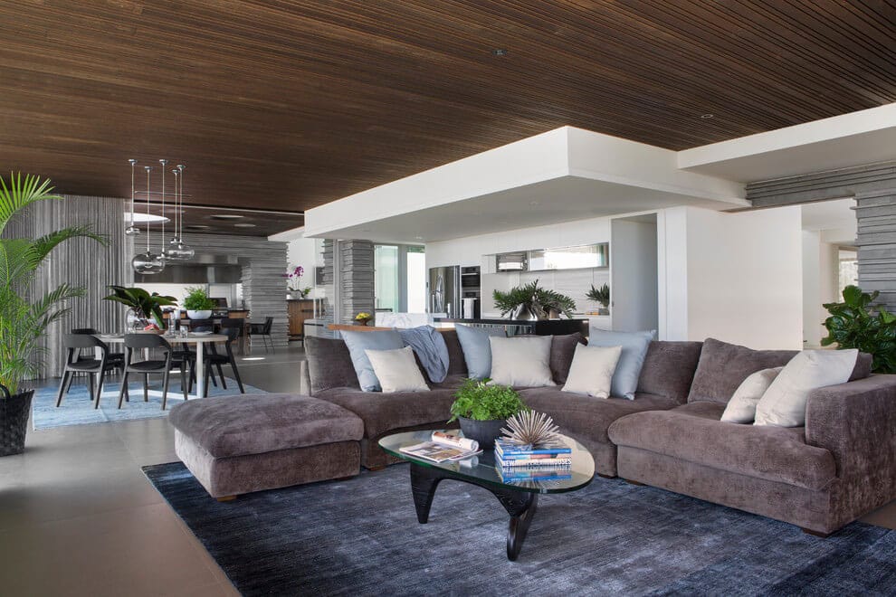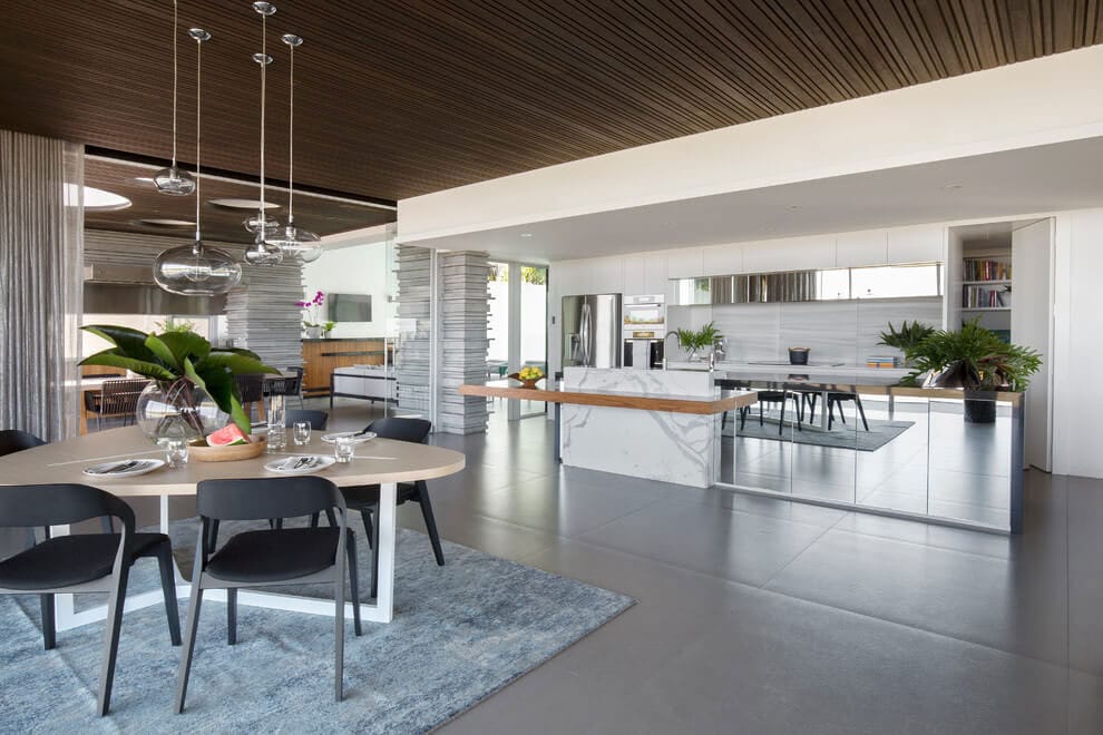 Large floor-to-ceiling windows frame some truly amazing views and help flood the spaces with natural light. They also open the living/dining/kitchen area to the sunny outdoors, where a white deck, blue swimming pool and green lawn await.