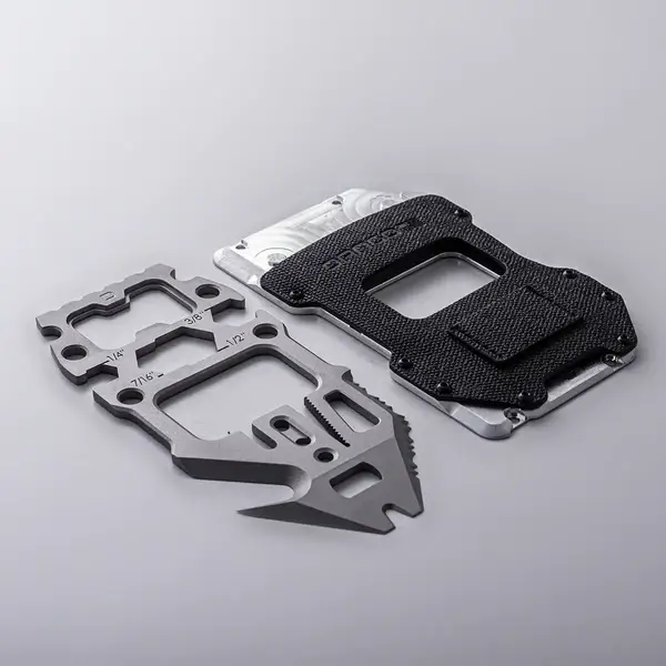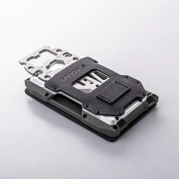 Moreover, it has the quintessential bottle opener, a hammer head, a serrated and sharp edge for cutting, two rope tensioners, a hook point, and a standard 1/4” inch hex wrench. Other hex wrench sizes include 3/8″, 1/2″, and 7/16″. The MT05 multi-tool easily slides into the proprietary DTEX Holster attached to the A10 wallet’s backplate. The backplate also doubles as an RFID blocker to protect your sensitive information from data theft.