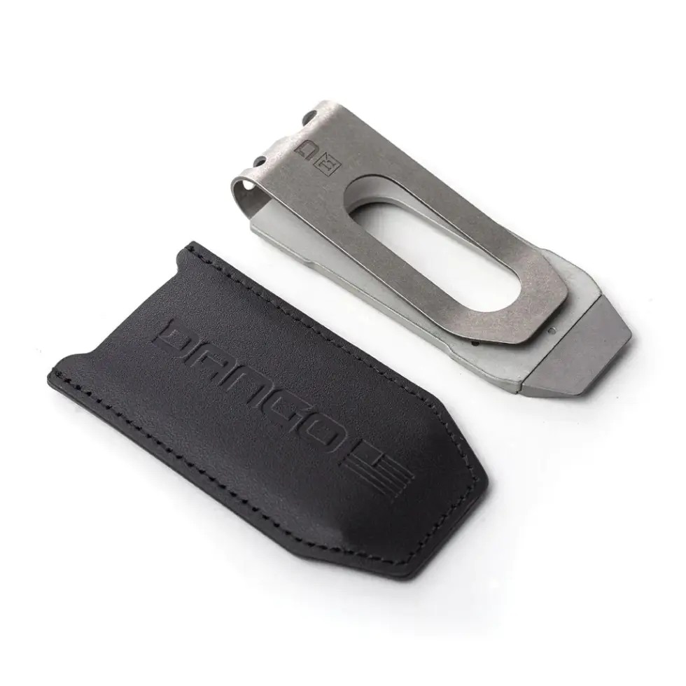 The clip is encased in a jet black top-grain leather sheath and measures 3.4″ L x 1.4″ W x 0.6″ D without the sheath and with the sheath at 3.5″ L x 1.6″ W x 0.7″ D. It is lightweight at merely 2 ounces thanks to its titanium construction so it doesn’t add heft in your pocket if you’re bringing wads of cash.