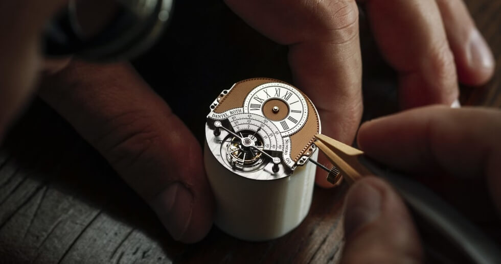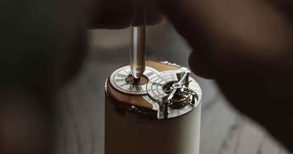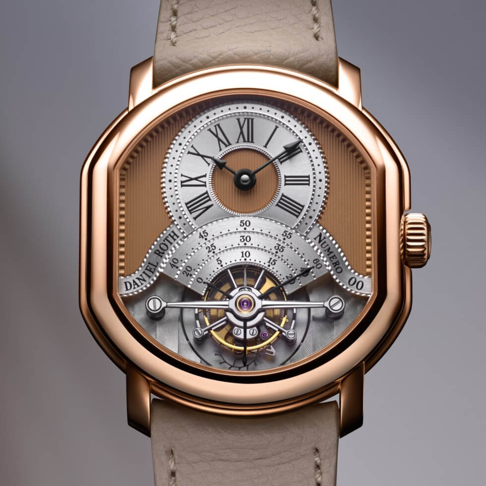 The watch features a dazzling rose gold dial by Daniel Roth and Kari Voutilainen’s The Workshop. Contrasting the pinkish tone of the precious metal are the distinct 20-second scales, signature, serialization, and hour/minute indices, rendered in solid 925 silver.