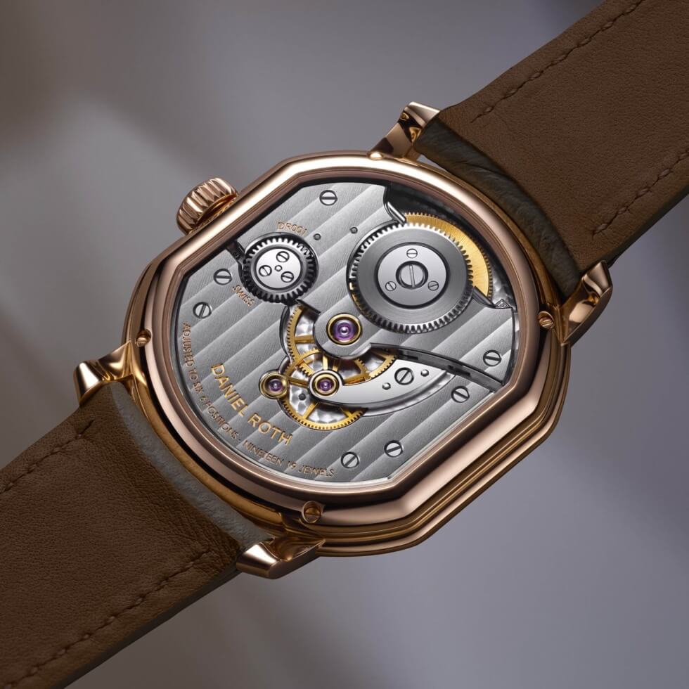 Gently flip the watch over to see an exhibition case back and the in-house DR001 caliber. Its manual movement measures 31 mm x 28 mm x 4.6 mm and delivers an 80-hour power reserve. Daniel Roth pairs the Tourbillion Rose Gold with a brown/beige calfskin leather strap.