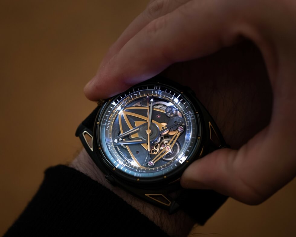 From the two-tone black/gold colorway of the watch, F1 enthusiasts recognize it as a tribute to the Lotus John Player Special race cars back in the 1970s. The blackout theme looks even more striking with the golden elements that adorn its construction. It features a black zirconium caseband with a black DLC stainless-steel bezel and caseback.