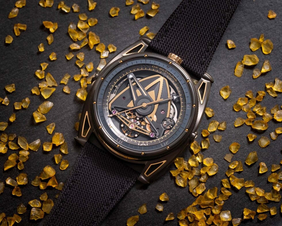 If you’re looking for the crown, it’s in gold and at 12 o’clock. The De Bethune DB28GS JPS uses floating lugs that are crafted out of grade 5 titanium that holds either a black rubber strap or black canvas/leather strap. The closure system is a folding clasp in grade 5 titanium.