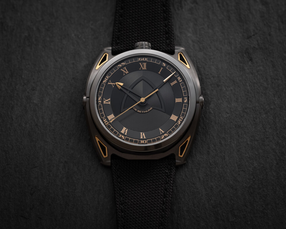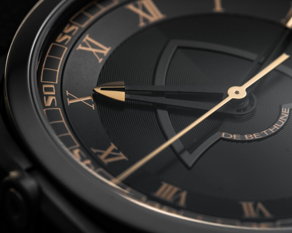 Its chapter ring is in black microlight with Roman numeral hour markers and Arabic numeral indices in increments of five. The hour and minute hands are in black with golden tips, while the seconds hand is all in gold. De Bethune pairs a black textile with an alligator leather strap to the Titan Hawk JPS.