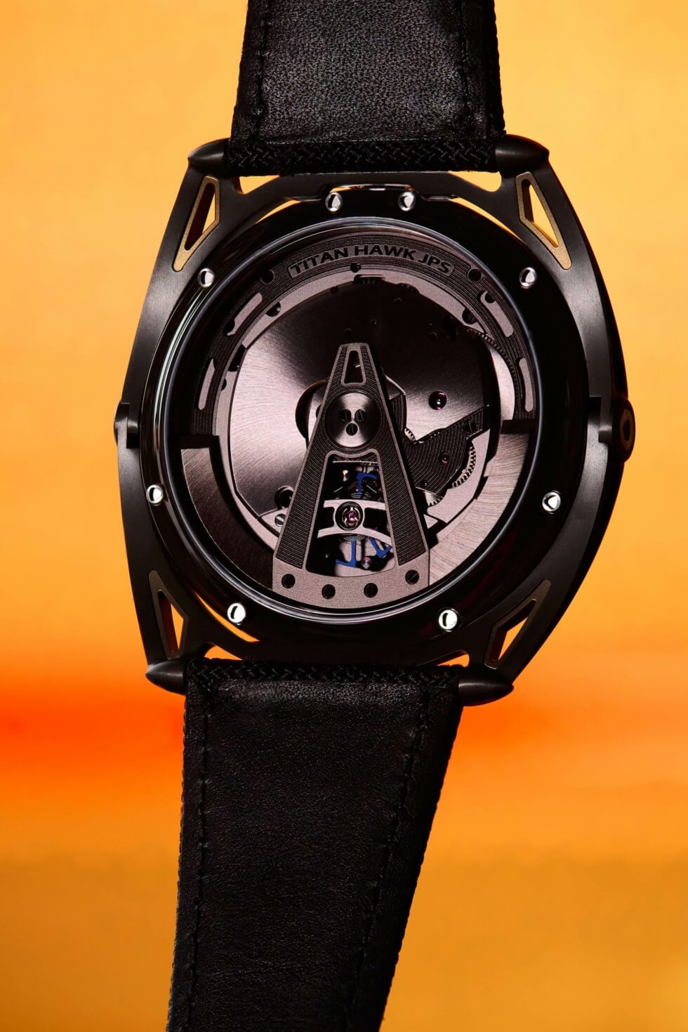 The Titan Hawk JPS is just as striking from the rear with its exhibition case back and tinted sapphire crystal window. Here we can catch a glimpse of the rotor of its intricate 29-jewel AUTOV2 self-winding movement. This 217-component caliber boasts a 60-hour power reserve and 28,800 vph frequency.