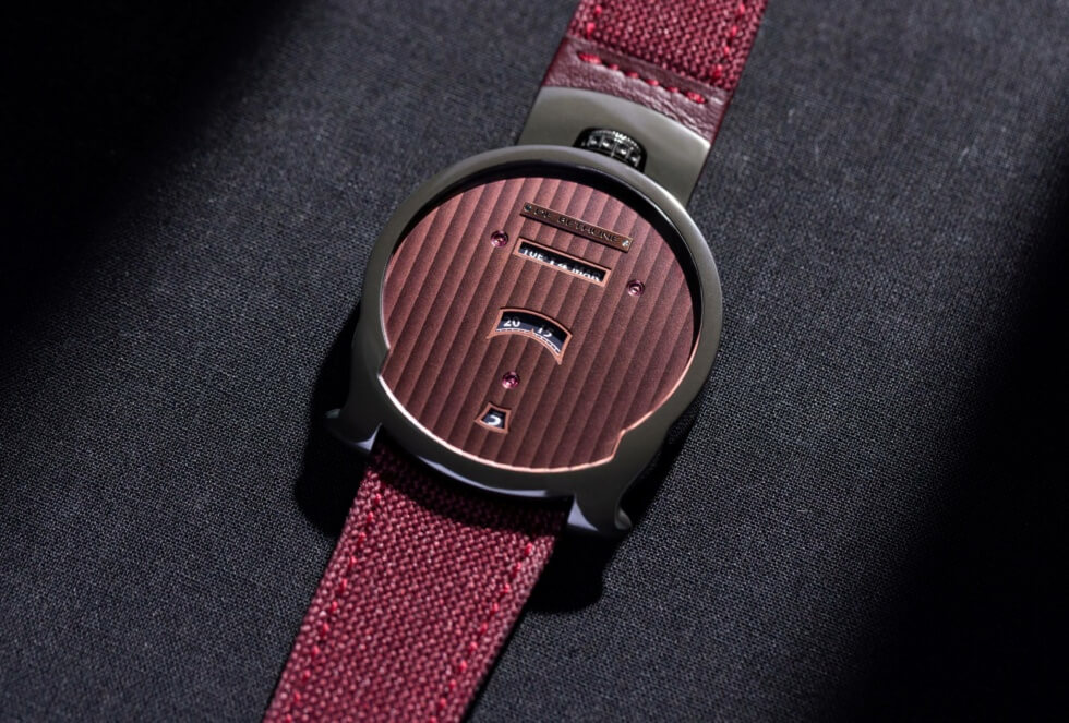 De Bethune frames a burgundy dial with a Côtes de Genève pattern under a sapphire crystal. It features apertures for day/date/month calendar, jumping hours, and minutes along with the signature at 12 o’clock. Finally, The DBD Digitale Season 2 comes with a burgundy/black alligator leather/textile strap.