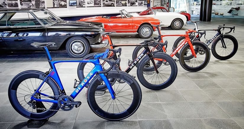 They first introduced the De Rosa SK Pininfarina to the world at the 2015 Eurobike event in Germany. The bicycle weighs only 6.5 kg (14.3 lbs.), boasting a carbon fiber frame developed with a new inner mold tooling technology. Beautifully aerodynamic, it went through serious wind tunnel testing in order to ensure remarkably low drag and impressively high speeds.