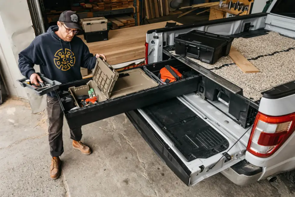 Not only does the Drawer System turn your truck’s bed into a customizable storage solution, but the top cover is tough enough to support various types of payloads. According to Decked, their product is constructed out of “high impact resistant polymer resin co-molded to a steel subframe.” Depending on the size of the vehicle, it can handle a load between 1,000 lbs. to 2,000 lbs.