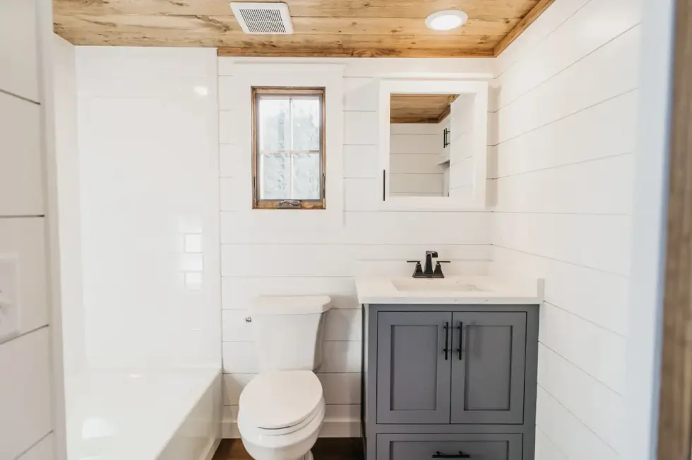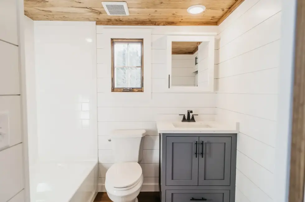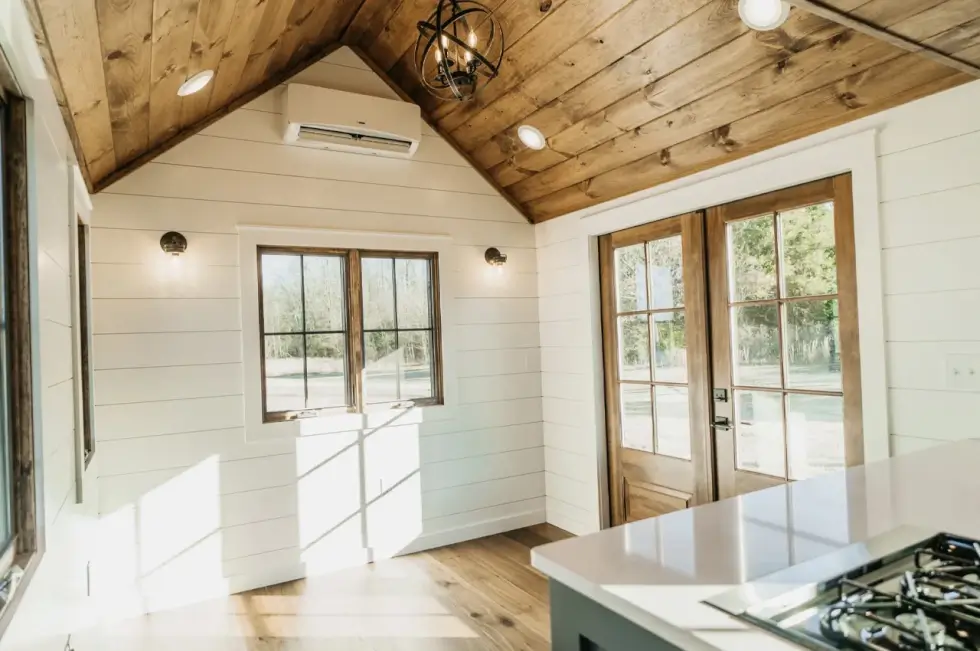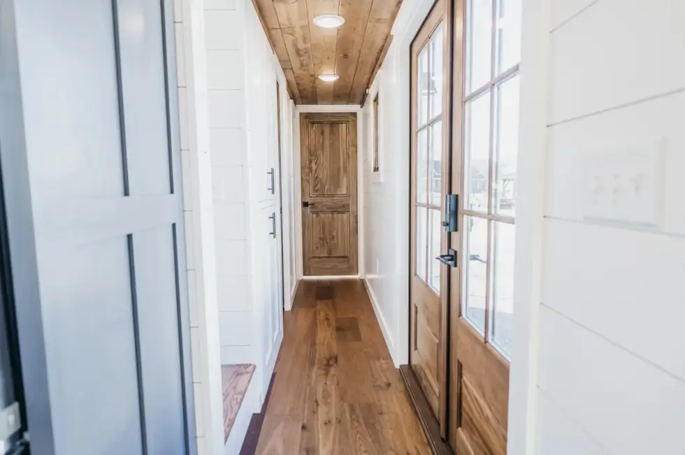Without the wheels, one wouldn’t even think of the Denali Bunkhouse as a mobile home. Its exterior alone mimics traditional cottage style homes with its board-and-batten siding topped with a standing-steam metal roof. The home’s facade carries into its interiors with the rustic shiplap walls, groove ceiling, and wood floors.