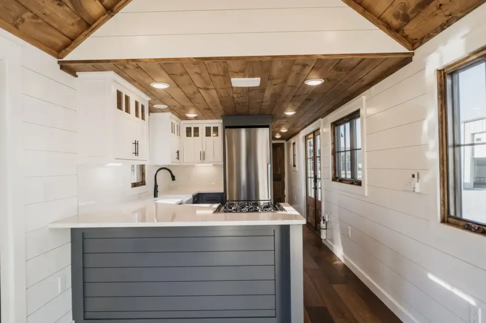 The Denali Bunkhouse features a well-equipped and spacious kitchen for a tiny home. It has built-in cupboards, a sink, a full-sized fridge/freezer, a four-burner stove, dishwasher, and ample countertop space for food prep and cooking. It even has a cozy breakfast bar for two.