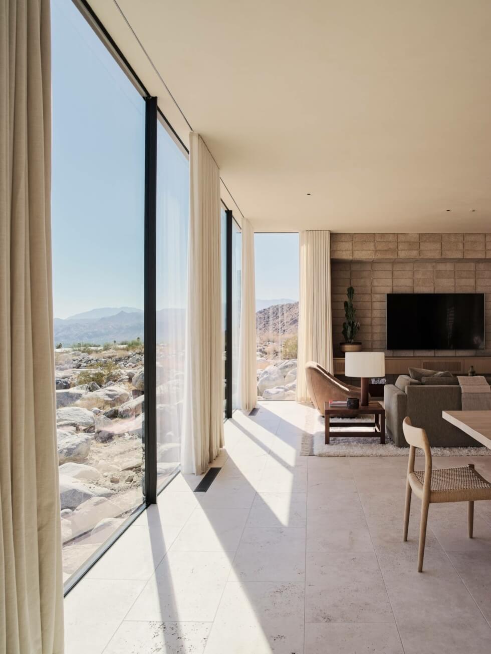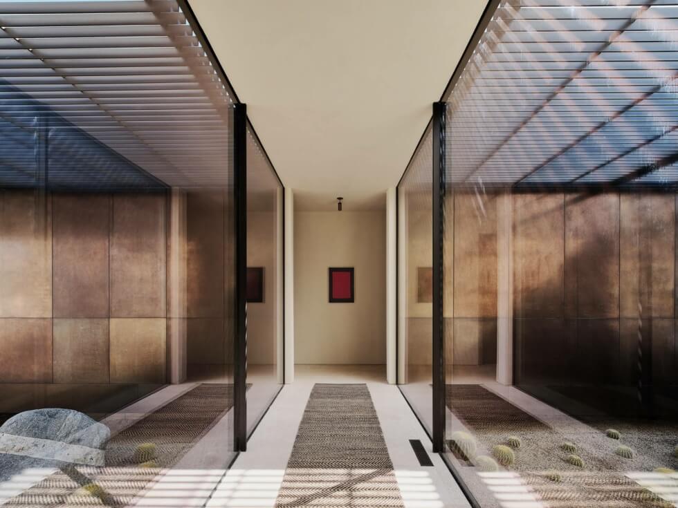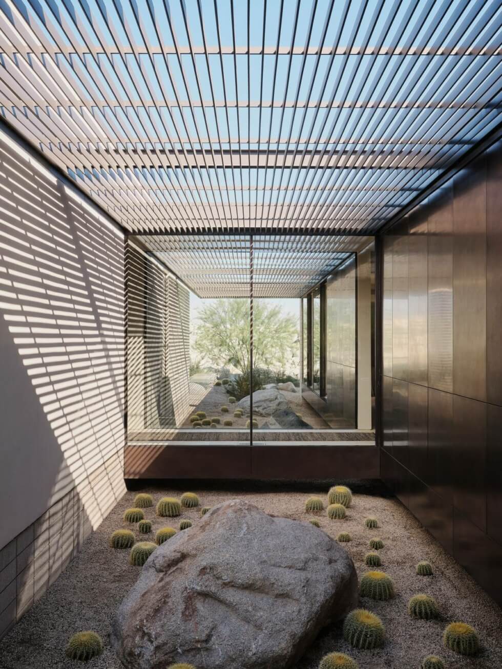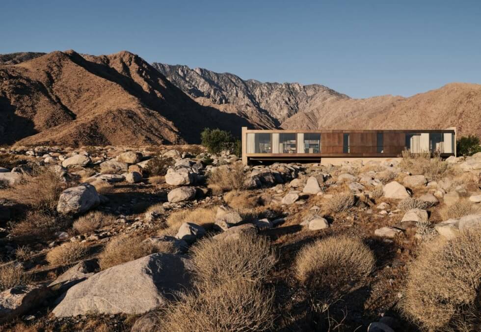 Moreover, it has an enclosed atrium that serves to connect the two ends physically. A glass bridge connects the guest quarters and ancillary spaces found at the rear. Every aspect of the Desert Palisades home, from materials, form, and sitting, was decided in relation to the exigencies of its rocky setting. The structure must preserve the existing desert site, give ample views of the nearby San Jacinto Mountains and valley floor, and address the relentless sunshine that basks the desert oasis on a daily.