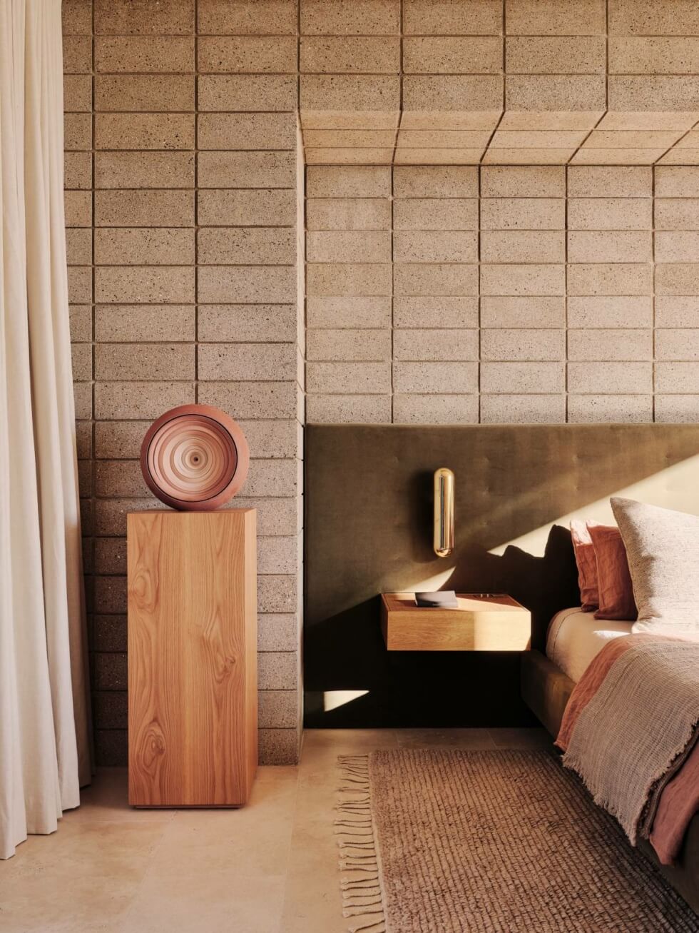 Its design “celebrates and elevates the tenets of desert modernism.” It even uses subdued colors to match the rocky topography. The monolithic volume comes wrapped in panels of natural patinated brass that age gracefully with rain and sun.