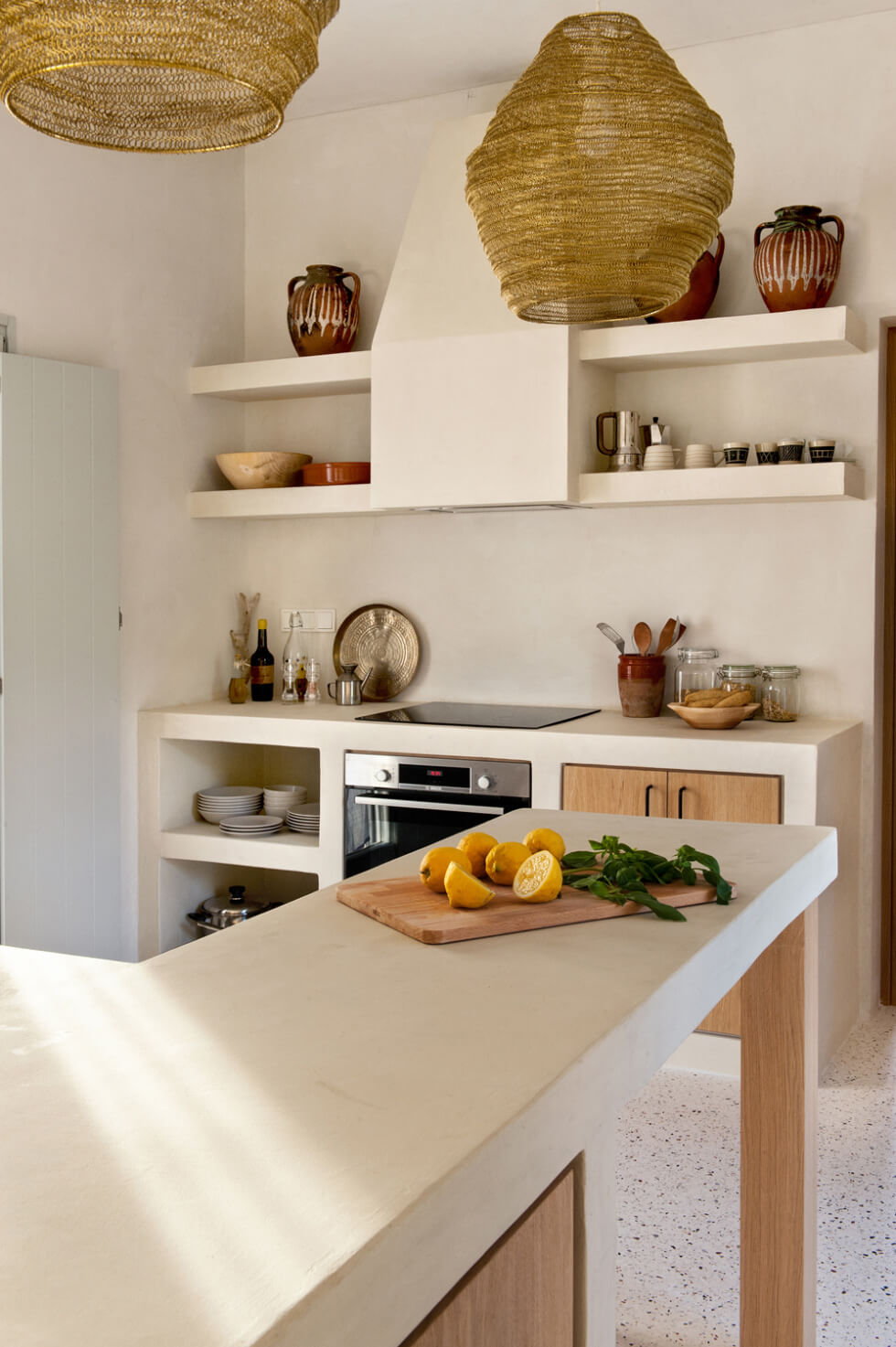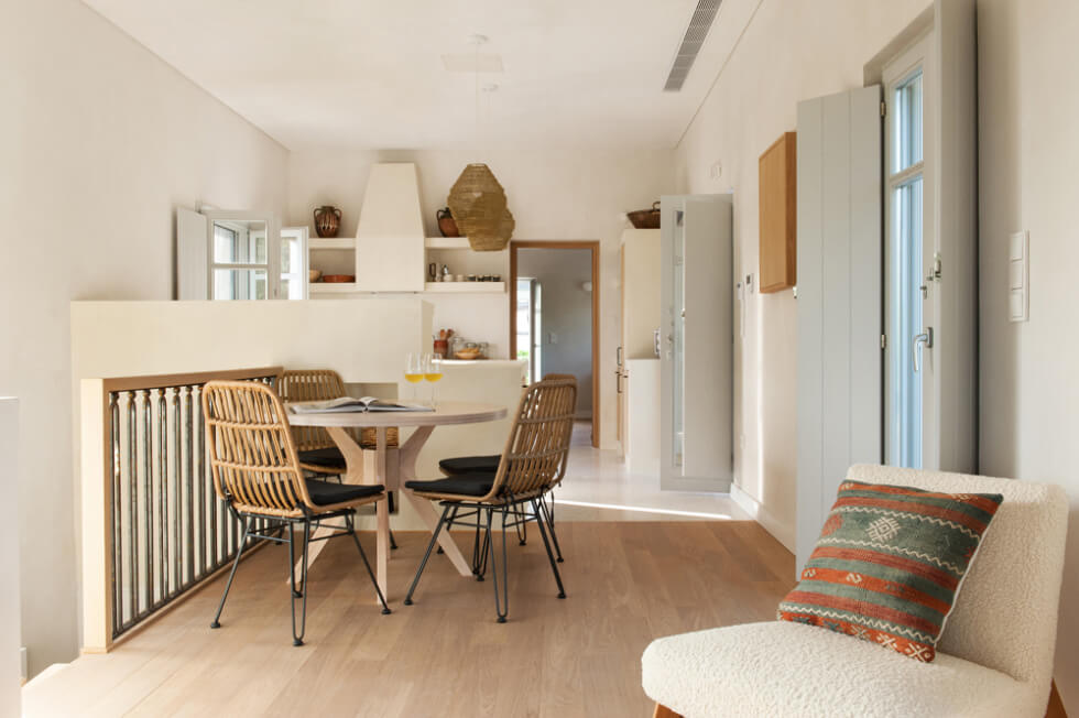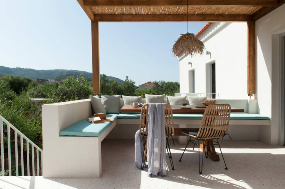 The restoration of Tou Panou also called for the enlargement of windows to allow natural light and air while opening views to the sea. DETALE retained the original mosaic floors in the kitchen and out onto a pergola-covered terrace that frames the Taygetos Mountain peak.