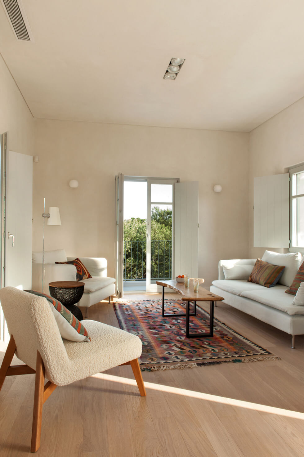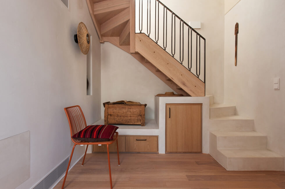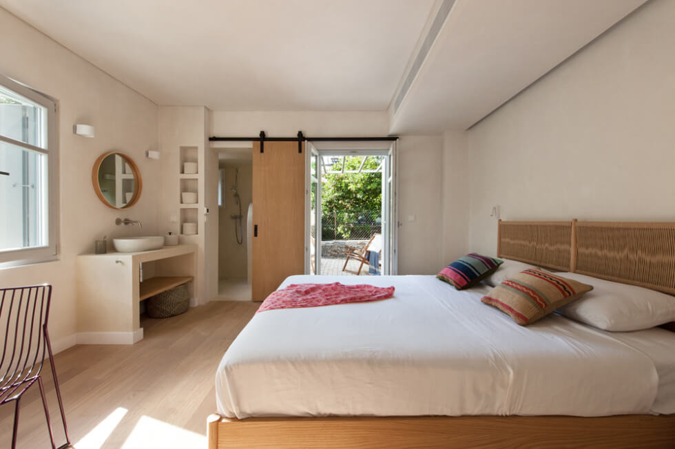 The renovated building features an inverted floor layout in which the private spaces are on the ground floor and public spaces are on the upper floor. The ground floor hosts three bedrooms with ensuite bathrooms and a master bedroom with a dressing room. Another bedroom is ideal for guests as it has its own entrance.