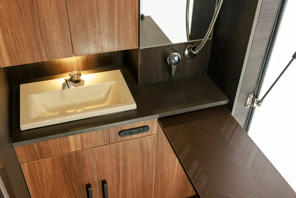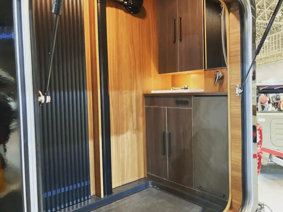 Moreover, its interiors also take into account the functionality of the layout and overall coziness. There are two points of entry. The BR75 has a door on the left side which opens to the living area. On the other hand, the rear portal reveals a sliding door for the shower room. This placement makes it easy to wash your gear to keep dirt, mud, and grime away from the spaces.