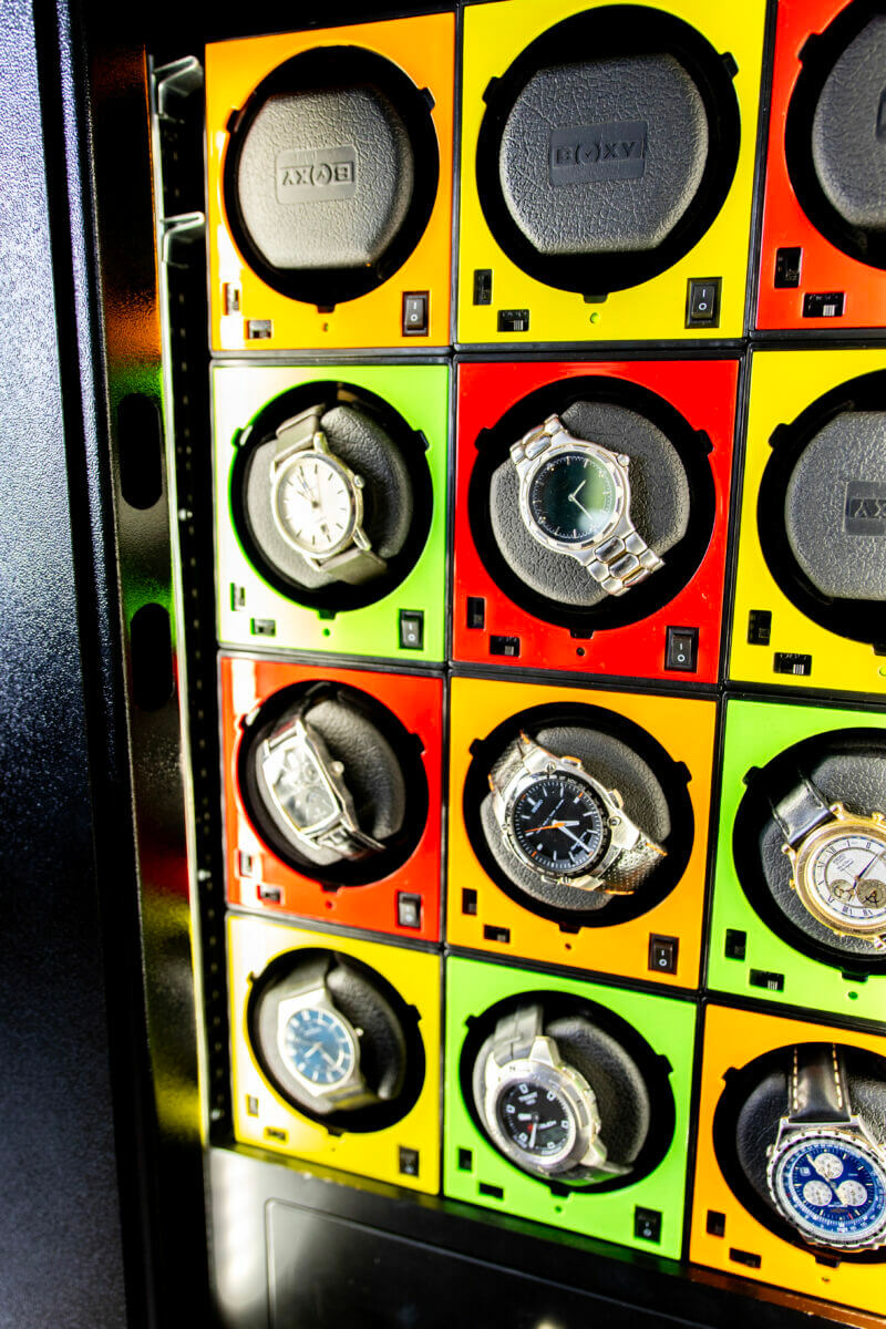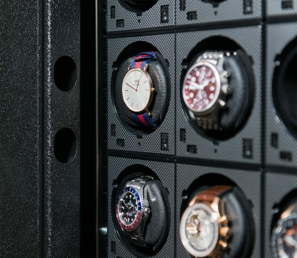 Blumsafe offers the BOXY Brick watch winders in seven shades: Carbon Fiber, Black, Fire Red, Orange, Yellow, and Green. The ideal arrangement for 12 is rows of three and stacks of four. Owners can program each unit with three speed settings and three rotational direction modes.