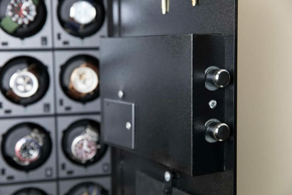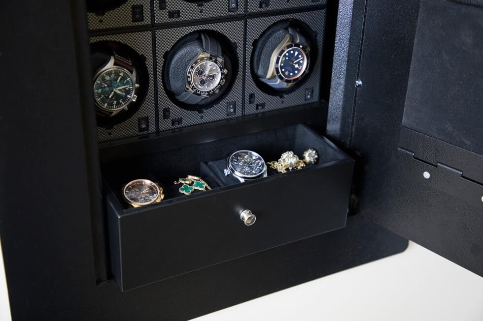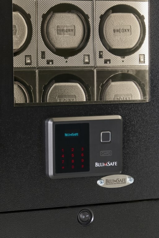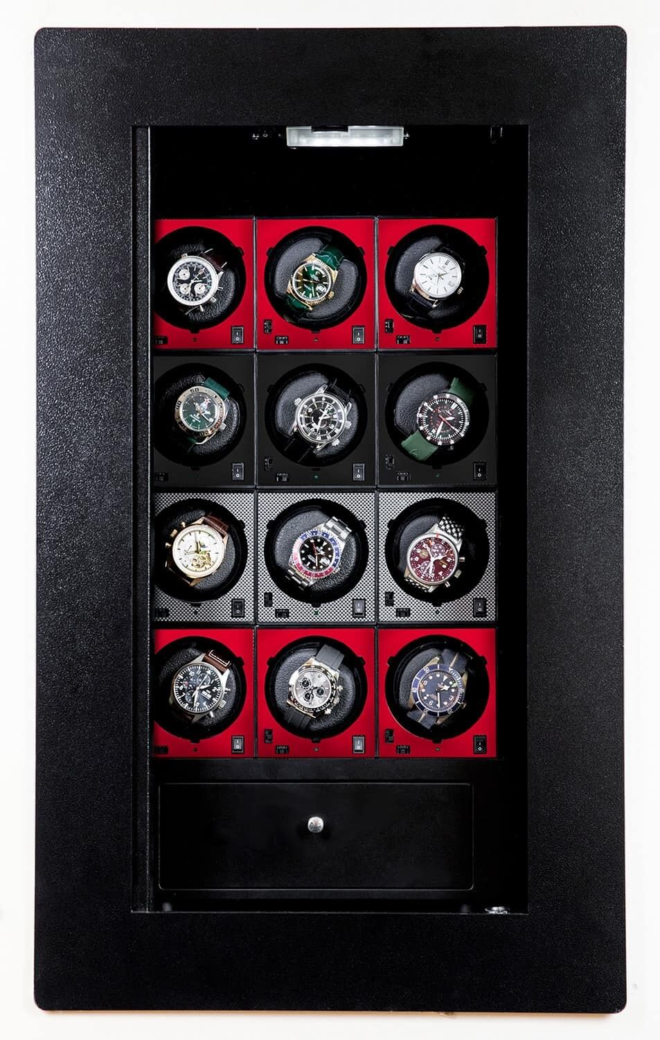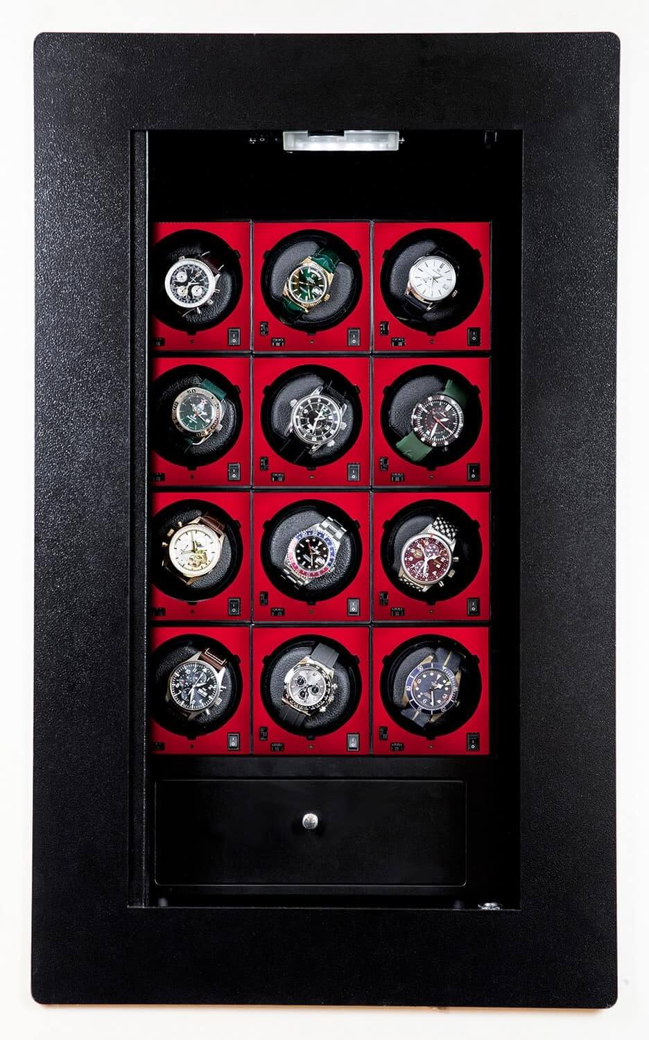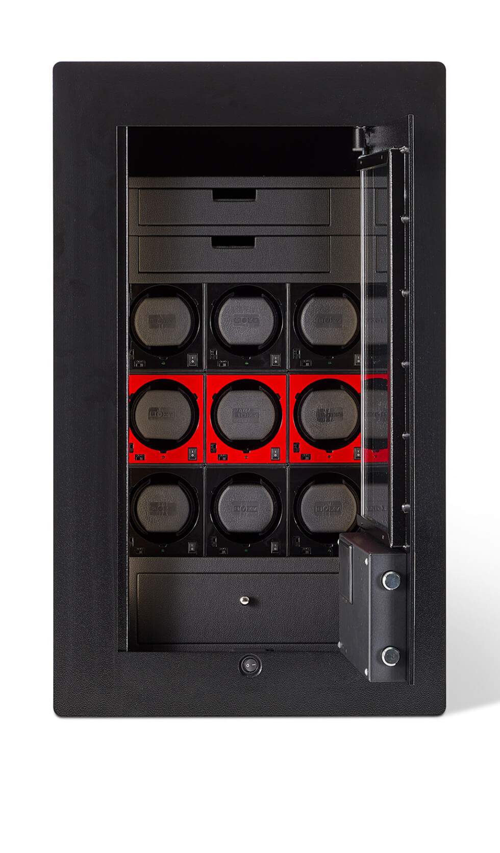 The Display Door BlumSafe measures 26.75″ x 14.22″ x 7.38″ (HxWxD) and weighs 60.1 lbs. This is a wall-mounted SKU that can accommodate up to 12 BOXY Brick watch winders. Moreover, optional configurations include 3x watch winders/6x jewelry drawers. 6x watch winders/4 jewelry drawers, or 9x watch winders/2x jewelry drawers.